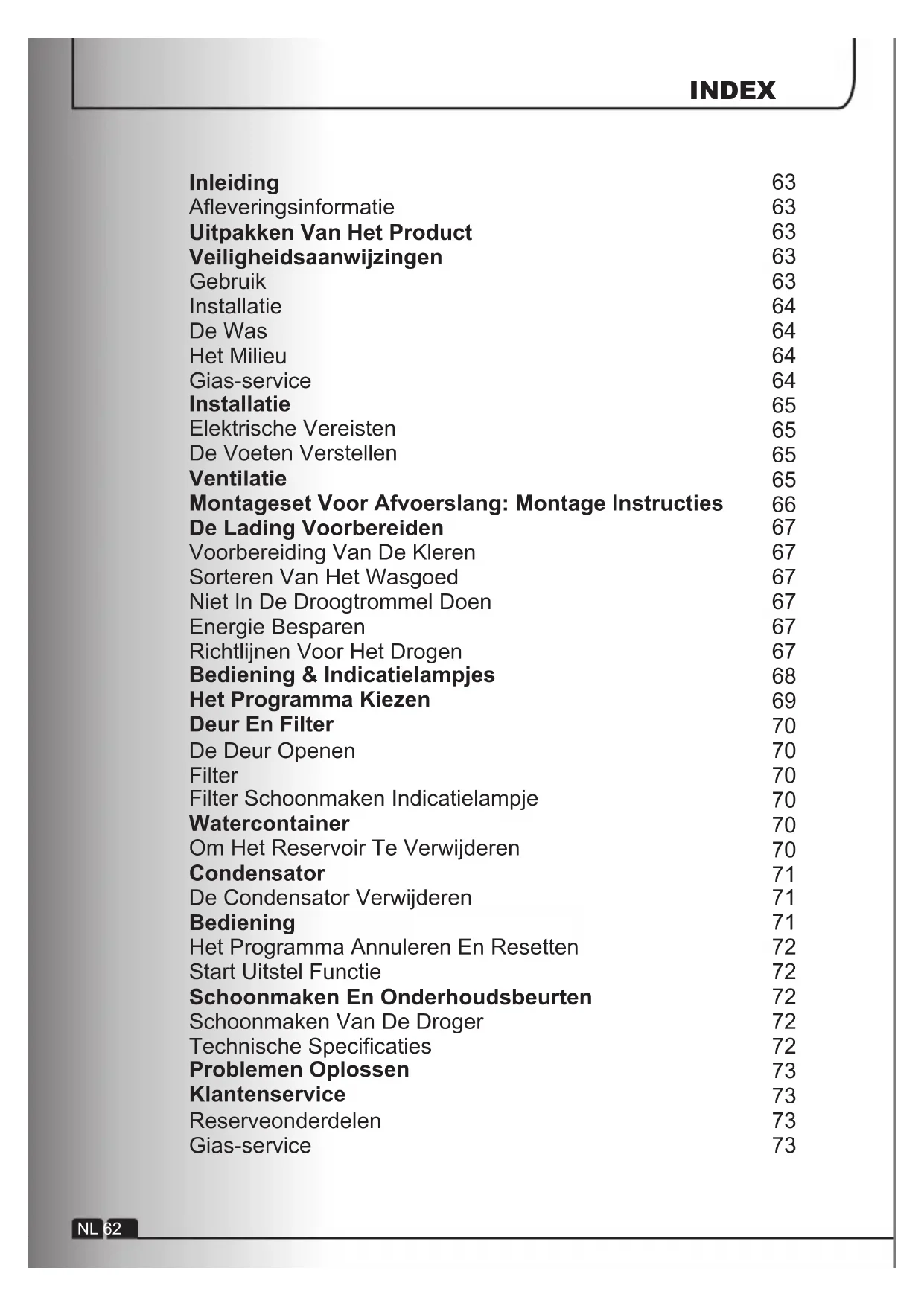 ● Deze machine is alleen voor huishoudelijk gebruik, m.a.w. voor het drogen van huishoudelijk textiel en kleding. ● Dit apparaat mag uitsluitend gebruikt worden voor het doel waarvoor het vervaardigd is, zoals dat in deze handleiding beschreven wordt. Verzeker u ervan dat u de instructies voor de installatie en het gebruik volledig begrijpt voordat u de machine gebruikt.● Raak de machine niet aan als uw handen of voeten nat of vochtig zijn. ● Leun niet tegen de deur als u de machine laadt en gebruik de deur niet om de machine op te tillen of te verplaatsen.● Sta niet toe dat kinderen met de machine of de bediening ervan spelen. ● WAARSCHUWING Gebruik het apparaat niet als de pluizenfilter niet geplaatst of beschadigd is; pluis kan ontbranden. ● WAARSCHUWING Op de plaats van het symbool voor warm oppervlak kan de temperatuur tijdens het drogen tot meer dan 60 graden C stijgen. ● Haal de stekker uit het stopcontact. Haal altijd de stekker uit het stopcontact voordat u de machine schoonmaakt.● Blijf deze machine niet gebruiken als ze een gebrek lijkt te hebben. ● Pluizen of dons mogen zich niet op de grond rondom de buitenkant van de machine ophopen.
