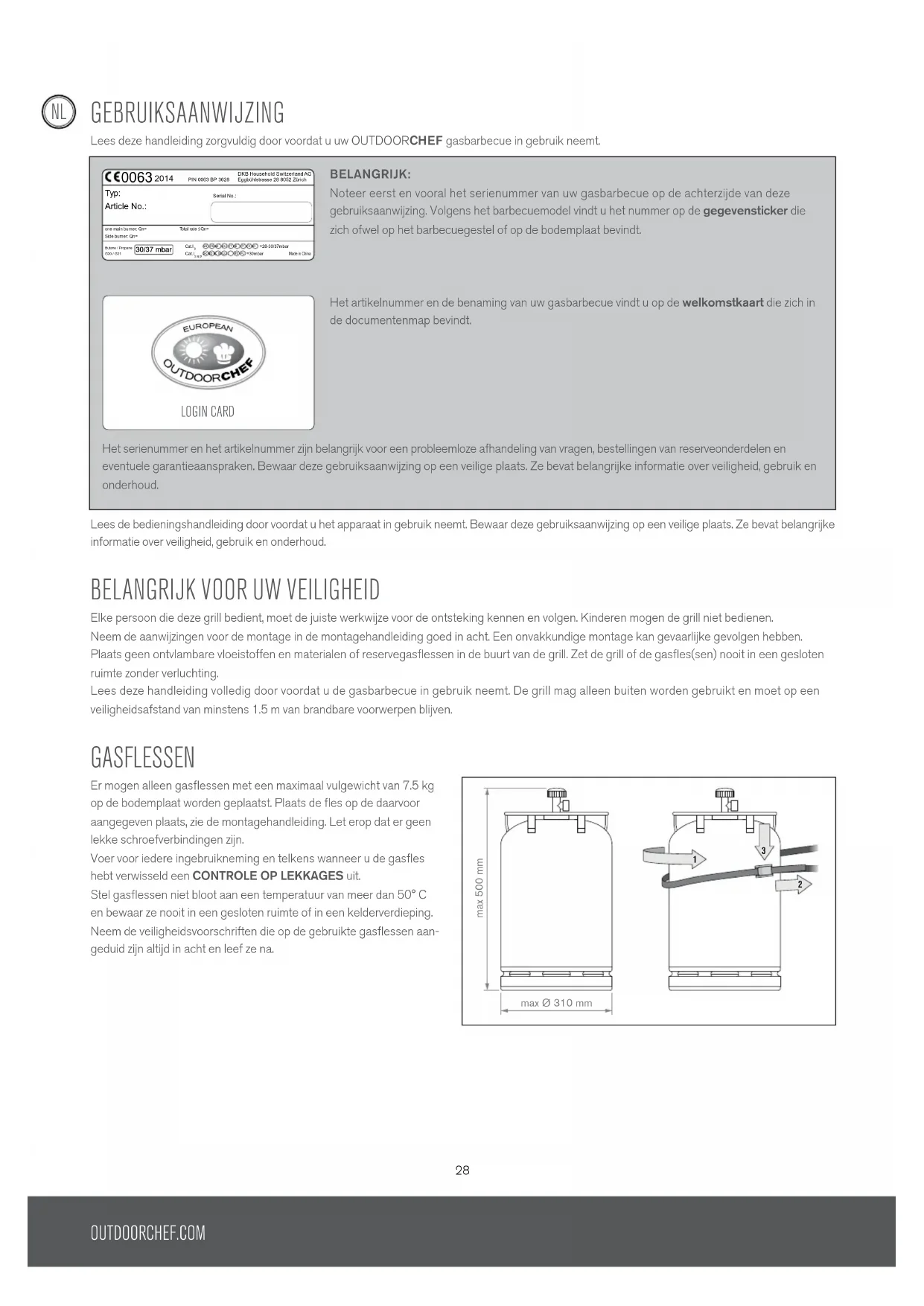 GEBRUIKSAANwIjzING Lees deze handleiding zorgvuldig door voordat u uw OUTDOORCHEF gasbarbecue in gebruik neemt. Lees de bedieningshandleiding door voordat u het apparaat in gebruik neemt. Bewaar deze gebruiksaanwijzing op een veilige plaats. Ze bevat belangrijke informatie over veiligheid, gebruik en onderhoud. BELANGRIjK vOOR Uw vEILIGHEID Elke persoon die deze grill bedient, moet de juiste werkwijze voor de ontsteking kennen en volgen. Kinderen mogen de grill niet bedienen. Neem de aanwijzingen voor de montage in de montagehandleiding goed in acht. Een onvakkundige montage kan gevaarlijke gevolgen hebben. Plaats geen ontvlambare vloeistoffen en materialen of reservegasflessen in de buurt van de grill. Zet de grill of de gasfles(sen) nooit in een gesloten ruimte zonder verluchting. Lees deze handleiding volledig door voordat u de gasbarbecue in gebruik neemt. De grill mag alleen buiten worden gebruikt en moet op een veiligheidsafstand van minstens 1.5 m van brandbare voorwerpen blijven. GASFLESSEN Er mogen alleen gasflessen met een maximaal vulgewicht van 7.5 kg op de bodemplaat worden geplaatst. Plaats de fles op de daarvoor aangegeven plaats, zie de montagehandleiding. Let erop dat er geen lekke schroefverbindingen zijn. Voer voor iedere ingebruikneming en telkens wanneer u de gasfles hebt verwisseld een CONTROLE OP LEKKAGES uit. Stel gasflessen niet bloot aan een temperatuur van meer dan 50° C en bewaar ze nooit in een gesloten ruimte of in een kelderverdieping. Neem de veiligheidsvoorschriften die op de gebruikte gasflessen aan- geduid zijn altijd in acht en leef ze na. max 500 mm max Ø 310 mm