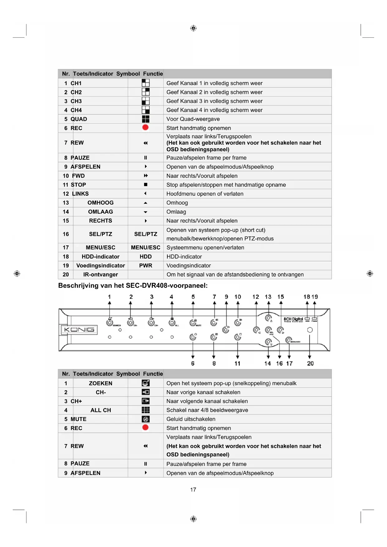 Openen van systeem pop-up (short cut) menubalk/bewerkknop/openen PTZ-modus 17 MENU/ESC MENU/ESC Systeemmenu openen/verlaten 18 HDD-indicator HDD HDD-indicator 19 Voedingsindicator PWR Voedingsindicator 20 IR-ontvanger Om het signaal van de afstandsbediening te ontvangen Beschrijving van het SEC-DVR408-voorpaneel: Nr. Toets/Indicator Symbool Functie 1 ZOEKEN Open het systeem pop-up (snelkoppeling) menubalk 2 CH- Naar vorige kanaal schakelen 3 CH+ Naar volgende kanaal schakelen 4 ALL CH Schakel naar 4/8 beeldweergave 5 MUTE Geluid uitschakelen 6 REC Start handmatig opnemen 7 REW