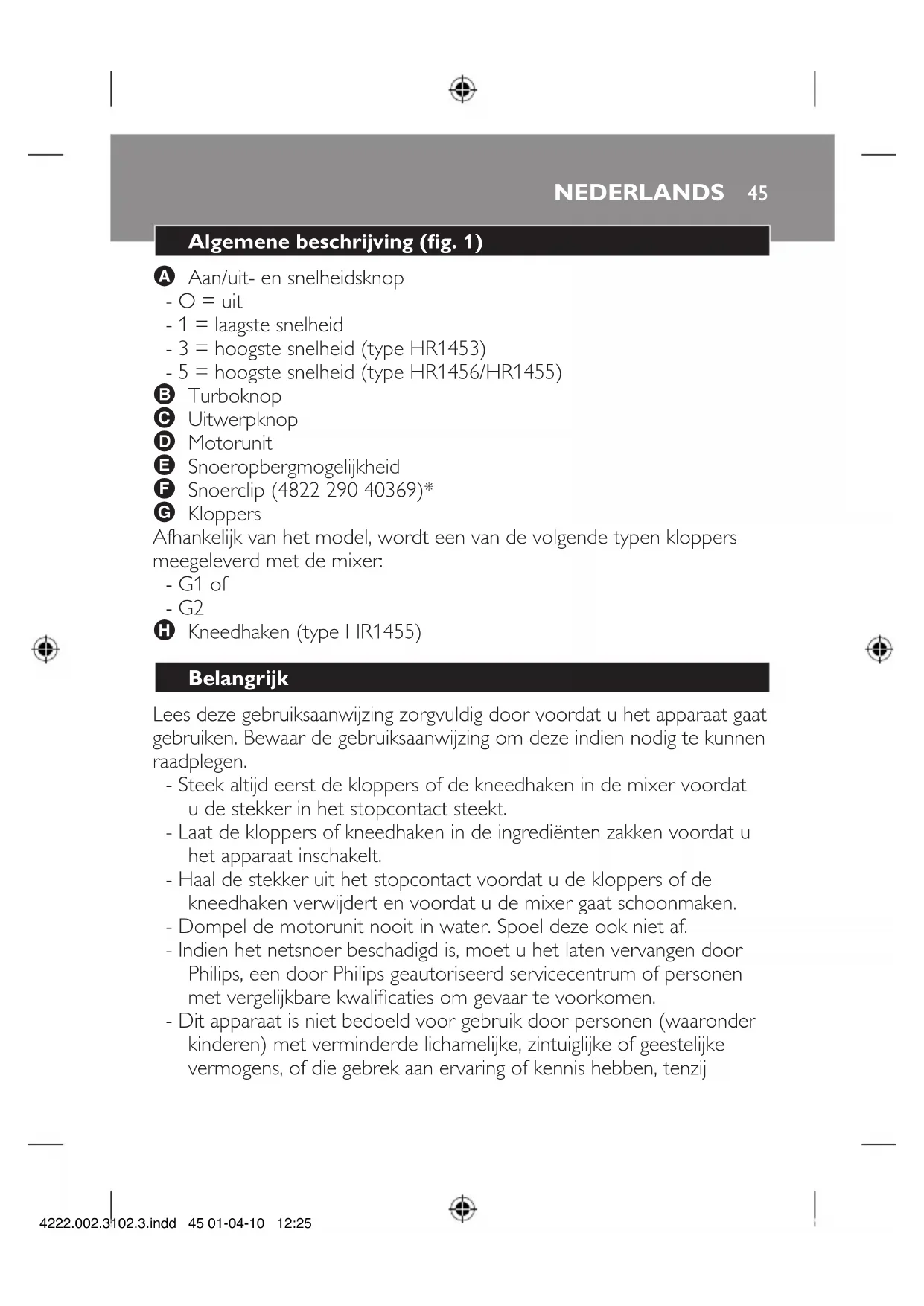 A Aan/uit- en snelheidsknop - O = uit - 1 = laagste snelheid - 3 = hoogste snelheid (type HR1453) - 5 = hoogste snelheid (type HR1456/HR1455) B Turboknop C Uitwerpknop D Motorunit E Snoeropbergmogelijkheid F Snoerclip (4822 290 40369)* G Kloppers Afhankelijk van het model, wordt een van de volgende typen kloppers meegeleverd met de mixer: - G1 of - G2 H Kneedhaken (type HR1455)
