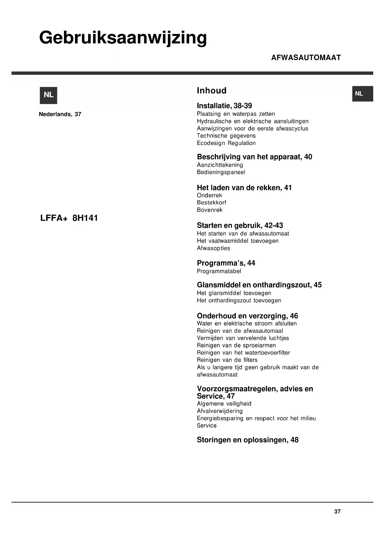 Gebruiksaanwijzing Inhoud Installatie, 38-39 Plaatsing en waterpas zetten Hydraulische en elektrische aansluitingen Aanwijzingen voor de eerste afwascyclus Technische gegevens Ecodesign Regulation Beschrijving van het apparaat, 40 Aanzichttekening Bedieningspaneel Het laden van de rekken, 41 Onderrek Bestekkorf Bovenrek Starten en gebruik, 42-43 Het starten van de afwasautomaat Het vaatwasmiddel toevoegen Afwasopties Programma’s, 44 Programmatabel Glansmiddel en onthardingszout, 45 Het glansmiddel toevoegen Het onthardingszout toevoegen Onderhoud en verzorging, 46 Water en elektrische stroom afsluiten Reinigen van de afwasautomaat Vermijden van vervelende luchtjes Reinigen van de sproeiarmen Reinigen van het watertoevoerfilter Reinigen van de filters Als u langere tijd geen gebruik maakt van de afwasautomaat Voorzorgsmaatregelen, advies en Service, 47 Algemene veiligheid Afvalverwijdering Energiebesparing en respect voor het milieu Service Storingen en oplossingen, 48 Nederlands, 37