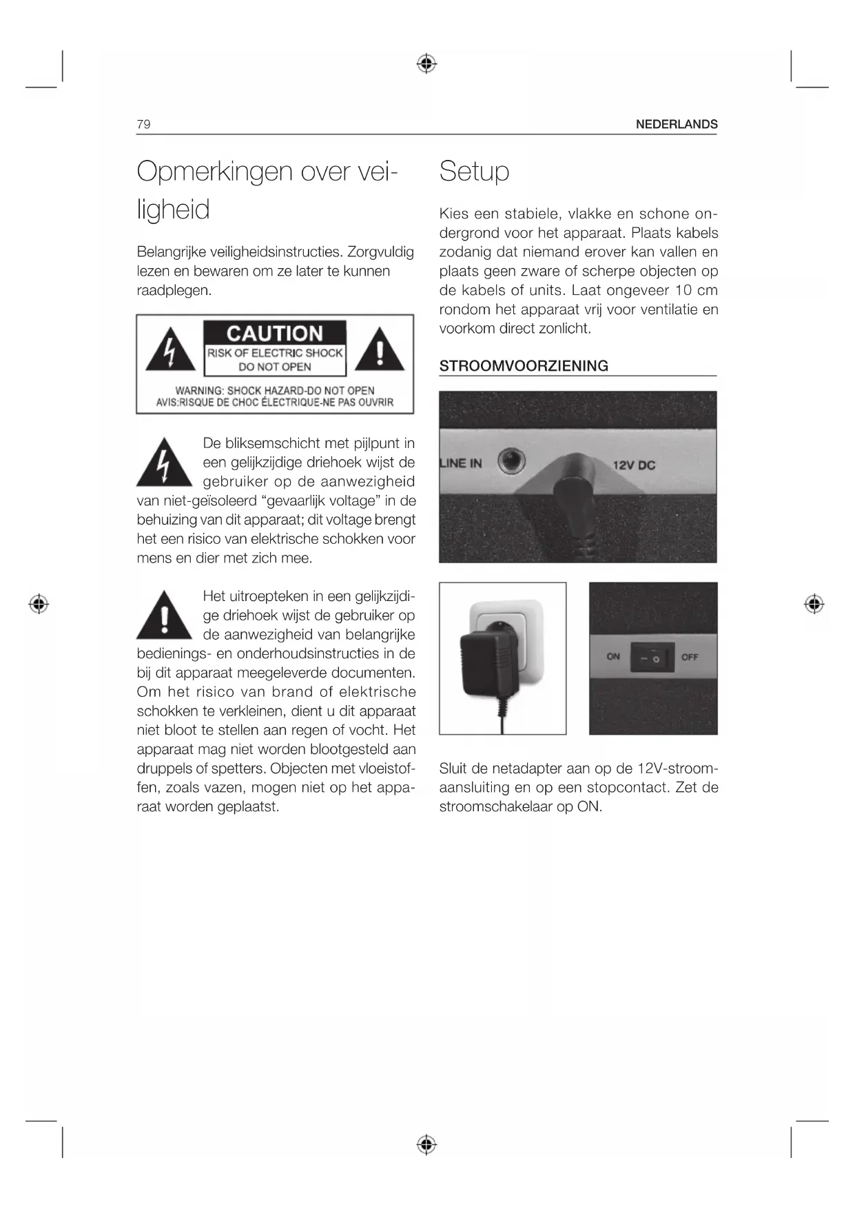 Opmerkingen over vei- ligheid De bliksemschicht met pijlpunt in een gelijkzijdige driehoek wijst de gebruiker op de aanwezigheid van niet-geïsoleerd “gevaarlijk voltage” in de behuizing van dit apparaat; dit voltage brengt het een risico van elektrische schokken voor mens en dier met zich mee. Het uitroepteken in een gelijkzijdi- ge driehoek wijst de gebruiker op de aanwezigheid van belangrijke bedienings- en onderhoudsinstructies in de bij dit apparaat meegeleverde documenten. Om het risico van brand of elektrische schokken te verkleinen, dient u dit apparaat niet bloot te stellen aan regen of vocht. Het apparaat mag niet worden blootgesteld aan druppels of spetters. Objecten met vloeistof- fen, zoals vazen, mogen niet op het appa- raat worden geplaatst. Belangrijke veiligheidsinstructies. Zorgvuldig lezen en bewaren om ze later te kunnen raadplegen. Setup Kies een stabiele, vlakke en schone on- dergrond voor het apparaat. Plaats kabels zodanig dat niemand erover kan vallen en plaats geen zware of scherpe objecten op de kabels of units. Laat ongeveer 10 cm rondom het apparaat vrij voor ventilatie en voorkom direct zonlicht. STROOMVOORZIENING Sluit de netadapter aan op de 12V-stroom- aansluiting en op een stopcontact. Zet de stroomschakelaar op ON.NEDERLANDS