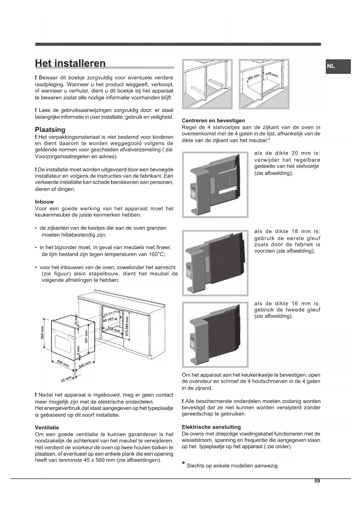 - voor het inbouwen van de oven, zowelonder het aanrecht (zie figuur) alsin stapelbouw, dient het meubel de volgende afmetingen te hebben: 595 mm. 595 mm.25 mm.545 mm.5 mm.567 mm.23 mm.575-585 mm.45 mm.558 mm. 547 mm. min. ! Nadat het apparaat is ingebouwd, mag er geen contact meer mogelijk zijn met de elektrische onderdelen. Het energieverbruik dat staat aangegeven op het typeplaatje is gebaseerd op dit soort installatie. Ventilatie Om een goede ventilatie te kunnen garanderen is het noodzakelijk de achterkant van het meubel te verwijderen. Het verdient de voorkeur de oven op twee houten balken te plaatsen, of eventueel op een enkele plank die een opening heeft van tenminste 45 x 560 mm (zie afbeeldingen). 560 mm. 45 mm. Centreren en bevestigen Regel de 4 stelvoetjes aan de zijkant van de oven in overeenkomst met de 4 gaten in de lijst, afhankelijk van de dikte van de zijkant van het meubel:* als de dikte 20 mm is: verwijder het regelbare gedeelte van het stelvoetje (zie afbeelding); als de dikte 18 mm is: gebruik de eerste gleuf zoals door de fabriek is voorzien (zie afbeelding); als de dikte 16 mm is: gebruik de tweede gleuf (zie afbeelding). Om het apparaat aan het keukenkastje te bevestigen: open de ovendeur en schroef de 4 houtschroeven in de 4 gaten in de zijrand. ! Alle beschermende onderdelen moeten zodanig worden bevestigd dat ze niet kunnen worden verwijderd zonder gereedschap te gebruiken. Elektrische aansluiting De ovens met driepolige voedingskabel functioneren met de wisselstroom, spanning en frequentie die aangegeven staan op het typeplaatje op het apparaat ( zie onder).