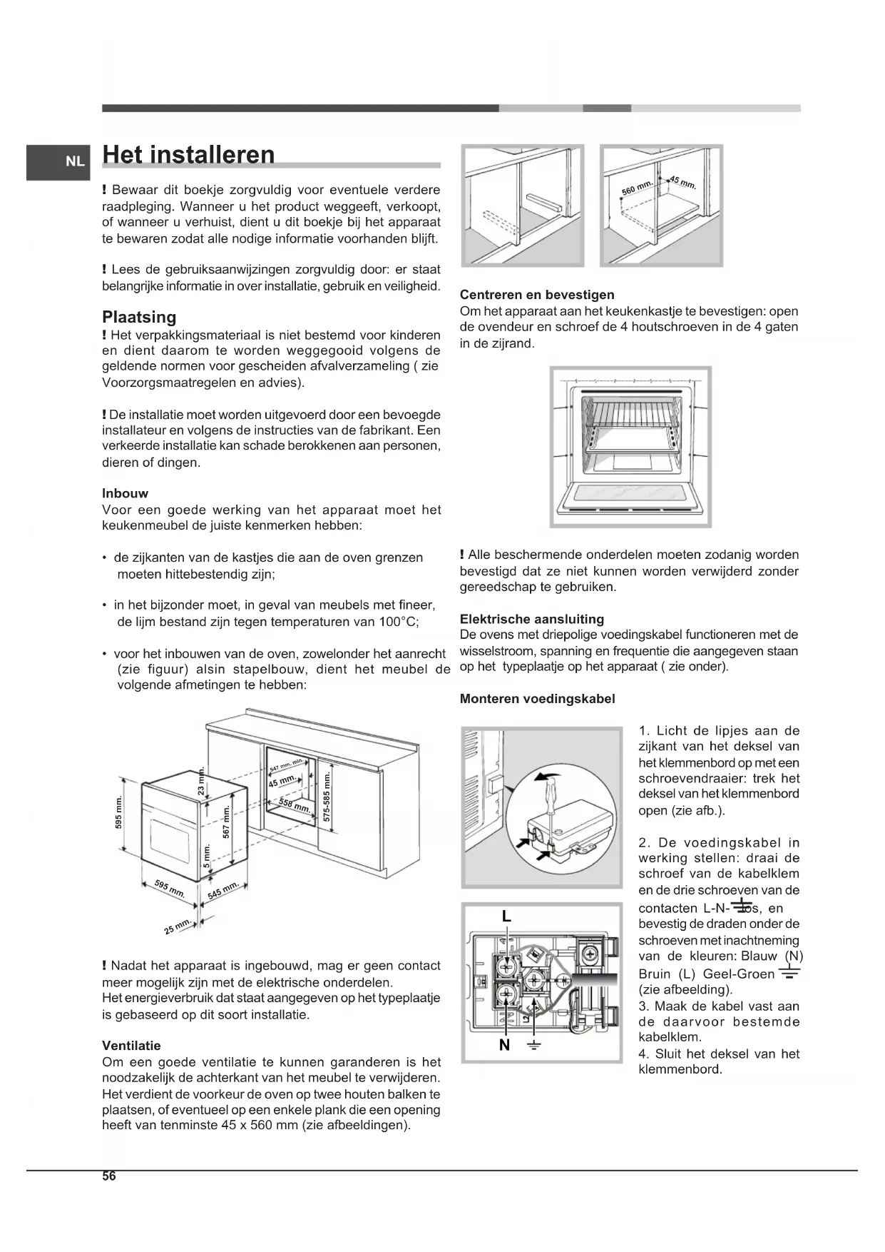 - voor het inbouwen van de oven, zowelonder het aanrecht (zie figuur) alsin stapelbouw, dient het meubel de volgende afmetingen te hebben: 595 mm. 595 mm. 25 mm. 545 mm.5 mm.567 mm.23 mm.575-585 mm.45 mm.558 mm. 547 mm. min. ! Nadat het apparaat is ingebouwd, mag er geen contact meer mogelijk zijn met de elektrische onderdelen. Het energieverbruik dat staat aangegeven op het typeplaatje is gebaseerd op dit soort installatie. Ventilatie Om een goede ventilatie te kunnen garanderen is het noodzakelijk de achterkant van het meubel te verwijderen. Het verdient de voorkeur de oven op twee houten balken te plaatsen, of eventueel op een enkele plank die een opening heeft van tenminste 45 x 560 mm (zie afbeeldingen). 560 mm. 45 mm. Centreren en bevestigen Om het apparaat aan het keukenkastje te bevestigen: open de ovendeur en schroef de 4 houtschroeven in de 4 gaten in de zijrand. ! Alle beschermende onderdelen moeten zodanig worden bevestigd dat ze niet kunnen worden verwijderd zonder gereedschap te gebruiken. Elektrische aansluiting De ovens met driepolige voedingskabel functioneren met de wisselstroom, spanning en frequentie die aangegeven staan op het typeplaatje op het apparaat ( zie onder). Monteren voedingskabel