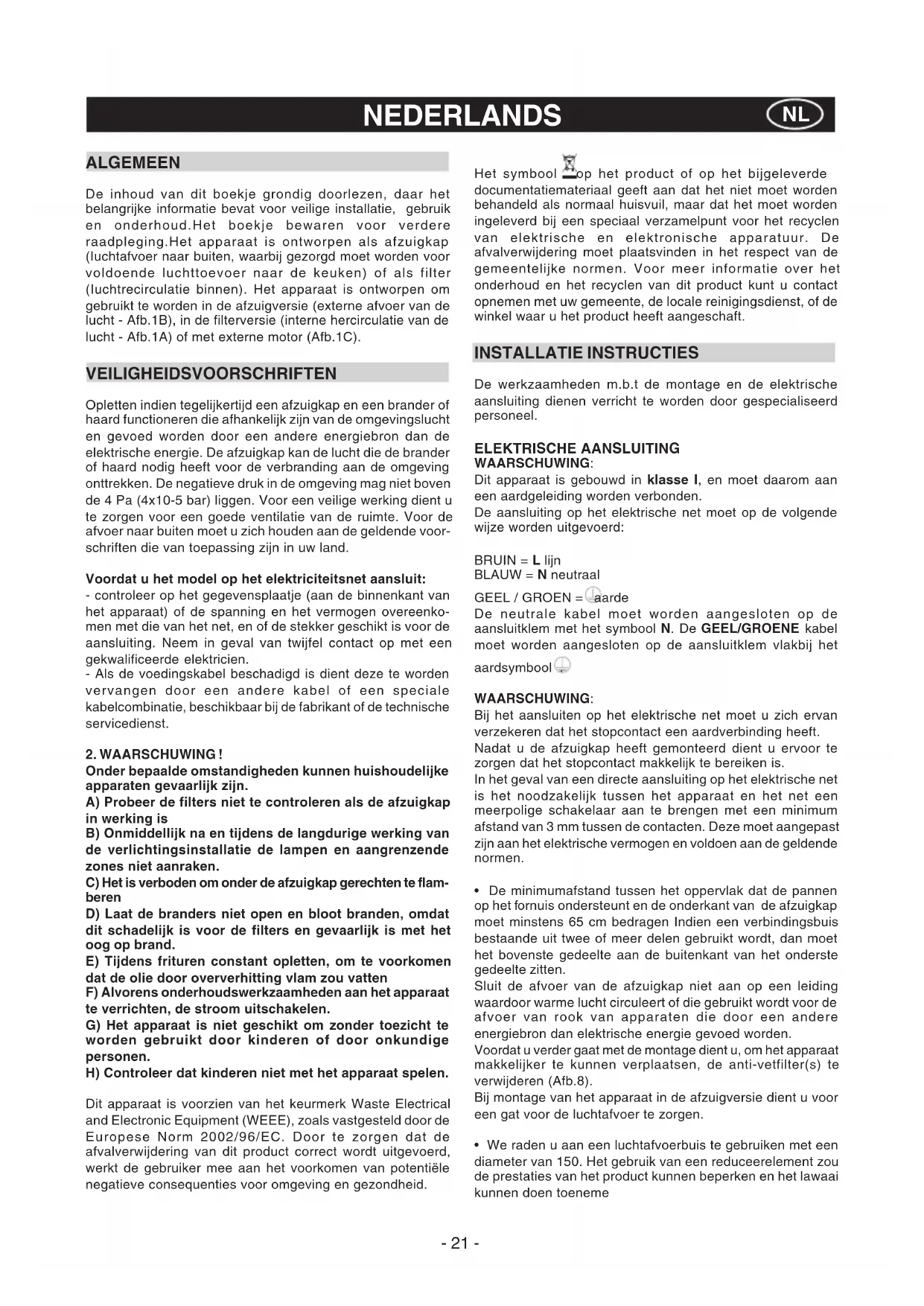 VEILIGHEIDSVOORSCHRIFTEN Opletten indien tegelijkertijd een afzuigkap en een brander of