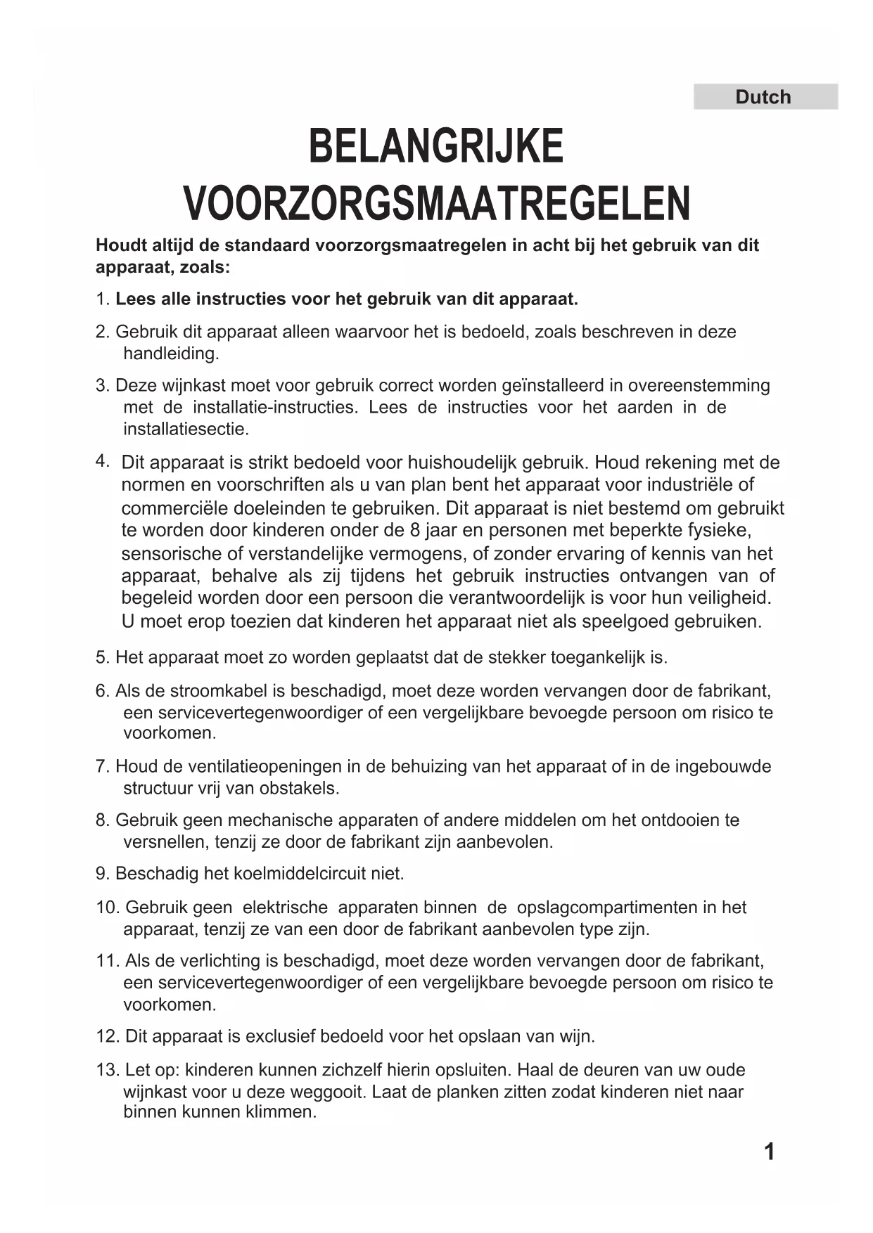 12. Dit apparaat is exclusief bedoeld voor het opslaan van wijn.