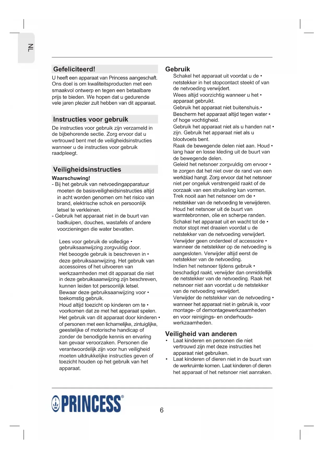 Gefeliciteerd! U heeft een apparaat van Princess aangeschaft. Ons doel is om kwaliteitsproducten met een smaakvol ontwerp en tegen een betaalbare prijs te bieden. We hopen dat u gedurende vele jaren plezier zult hebben van dit apparaat. Instructies voor gebruik De instructies voor gebruik zijn verzameld in de bijbehorende sectie. Zorg ervoor dat u vertrouwd bent met de veiligheidsinstructies wanneer u de instructies voor gebruik raadpleegt. Veiligheidsinstructies Waarschuwing! - Bij het gebruik van netvoedingapparatuur moeten de basisveiligheidsinstructies altijd in acht worden genomen om het risico van brand, elektrische schok en persoonlijk letsel te verkleinen. - Gebruik het apparaat niet in de buurt van badkuipen, douches, wastafels of andere voorzieningen die water bevatten. Lees voor gebruik de volledige gebruiksaanwijzing zorgvuldig door. Het beoogde gebruik is beschreven in deze gebruiksaanwijzing. Het gebruik van accessoires of het uitvoeren van werkzaamheden met dit apparaat die niet in deze gebruiksaanwijzing zijn beschreven, kunnen leiden tot persoonlijk letsel. Bewaar deze gebruiksaanwijzing voor toekomstig gebruik. Houd altijd toezicht op kinderen om te voorkomen dat ze met het apparaat spelen. Het gebruik van dit apparaat door kinderen of personen met een lichamelijke, zintuiglijke, geestelijke of motorische handicap of zonder de benodigde kennis en ervaring kan gevaar veroorzaken. Personen die verantwoordelijk zijn voor hun veiligheid moeten uitdrukkelijke instructies geven of toezicht houden op het gebruik van het apparaat. Gebruik Schakel het apparaat uit voordat u de netstekker in het stopcontact steekt of van de netvoeding verwijdert. Wees altijd voorzichtig wanneer u het apparaat gebruikt. Gebruik het apparaat niet buitenshuis. Bescherm het apparaat altijd tegen water of hoge vochtigheid. Gebruik het apparaat niet als u handen nat zijn. Gebruik het apparaat niet als u blootvoets bent. Raak de bewegende delen niet aan. Houd lang haar en losse kleding uit de buurt van de bewegende delen. Geleid het netsnoer zorgvuldig om ervoor te zorgen dat het niet over de rand van een werkblad hangt. Zorg ervoor dat het netsnoer niet per ongeluk verstrengeld raakt of de oorzaak van een struikeling kan vormen. Trek nooit aan het netsnoer om de netstekker van de netvoeding te verwijderen. Houd het netsnoer uit de buurt van warmtebronnen, olie en scherpe randen. Schakel het apparaat uit en wacht tot de motor stopt met draaien voordat u de netstekker van de netvoeding verwijdert. Verwijder geen onderdeel of accessoire wanneer de netstekker op de netvoeding is aangesloten. Verwijder altijd eerst de netstekker van de netvoeding. Indien het netsnoer tijdens gebruik beschadigd raakt, verwijder dan onmiddellijk de netstekker van de netvoeding. Raak het netsnoer niet aan voordat u de netstekker van de netvoeding verwijdert. Verwijder de netstekker van de netvoeding wanneer het apparaat niet in gebruik is, voor montage- of demontagewerkzaamheden en voor reinigings- en onderhouds- werkzaamheden. Veiligheid van anderen Laat kinderen en personen die niet vertrouwd zijn met deze instructies het apparaat niet gebruiken. Laat kinderen of dieren niet in de buurt van de werkruimte komen. Laat kinderen of dieren het apparaat of het netsnoer niet aanraken.7