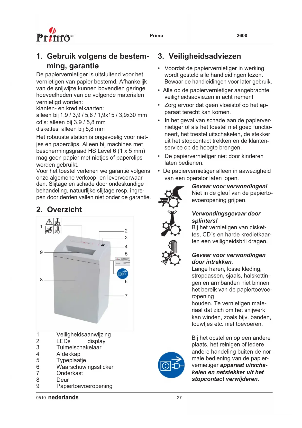 cd’s: alleen bij 3,9 / 5,8 mm diskettes : alleen bij 5,8 mm Het robuuste station is ongevoelig voor niet- jes en paperclips. Alleen bij machines met beschermingsgraad HS Level 6 (1 x 5 mm) mag geen papier met nietjes of paperclips worden gebruikt. Voor het toestel verlenen we garantie volgens onze algemene verkoop- en levervoorwaar- den. Slijtage en schade door ondeskundige behandeling, natuurlijke slijtage resp. ingre- pen door derden vallen niet onder de garantie.Primo 2600 Papiervernietiger 28 nederlands 0510