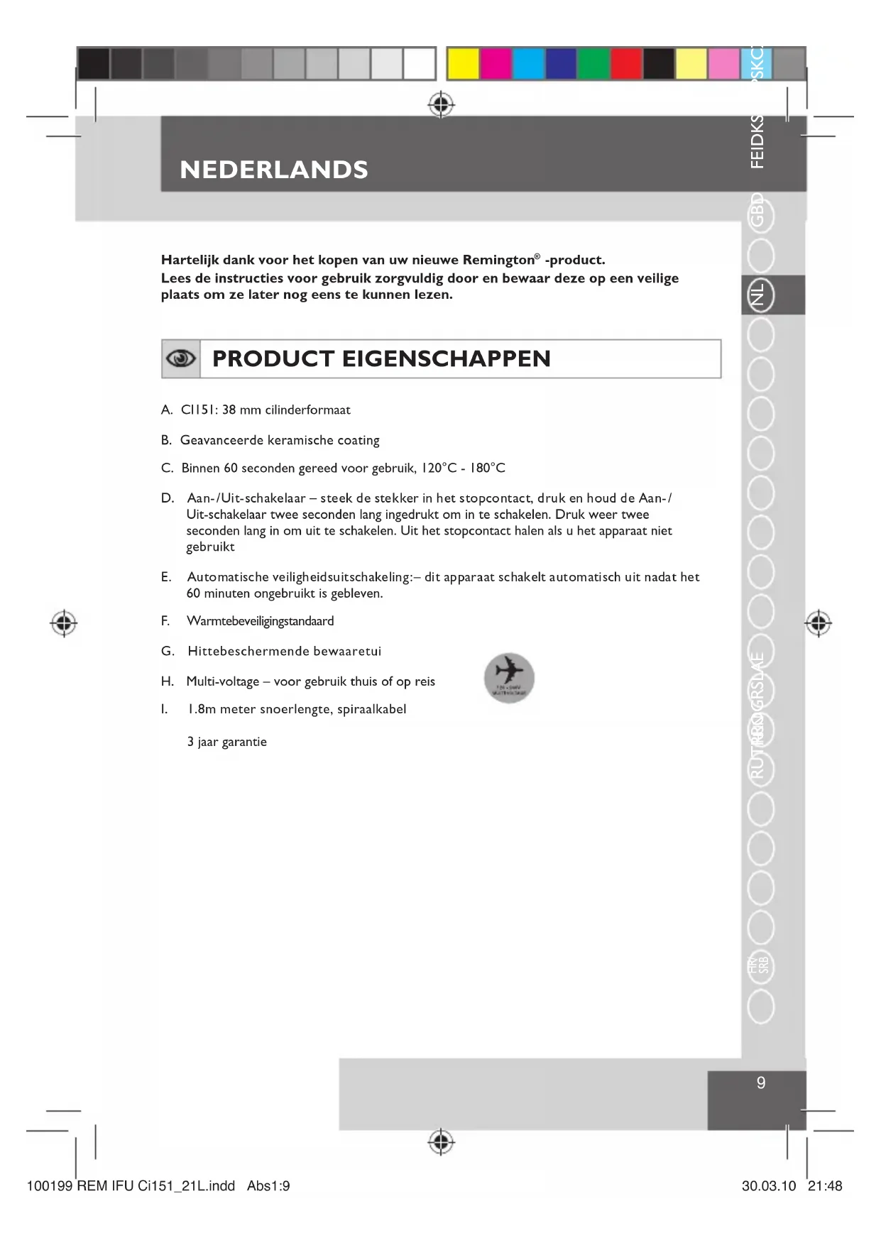 SRB NL Hartelijk dank voor het kopen van uw nieuwe Remington ® -product.Lees de instructies voor gebruik zorgvuldig door en bewaar deze op een veilige plaats om ze later nog eens te kunnen lezen. PRODUCT EIGENSCHAPPEN A. CI151: 38 mm cilinderformaatB. Geavanceerde keramische coatingC. Binnen 60 seconden gereed voor gebruik, 120°C - 180°C D. Aan-/Uit-schakelaar – steek de stekker in het stopcontact, druk en houd de Aan-/ Uit-schakelaar twee seconden lang ingedrukt om in te schakelen. Druk weer twee seconden lang in om uit te schakelen. Uit het stopcontact halen als u het apparaat niet gebruikt E. Automatische veiligheidsuitschakeling:– dit apparaat schakelt automatisch uit nadat het 60 minuten ongebruikt is gebleven.F. WarmtebeveiligingstandaardG. Hittebeschermende bewaaretuiH. Multi-voltage – voor gebruik thuis of op reisI. 1.8m meter snoerlengte, spiraalkabel 3 jaar garantie 100199 REM IFU Ci151_21L.indd Abs1:9100199 REM IFU Ci151_21L.indd Abs1:9 30.03.10 21:4830.03.10 21:48NEDERLANDS