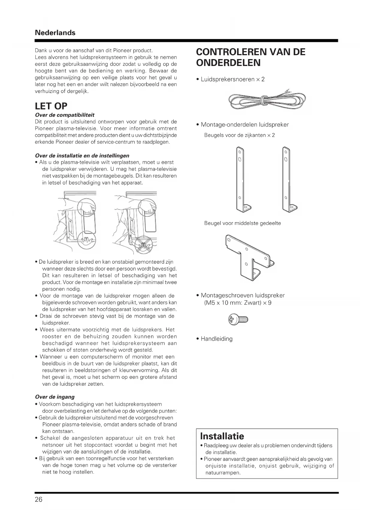 LET OP Over de compatibiliteit Dit product is uitsluitend ontworpen voor gebruik met dePioneer plasma-televisie. Voor meer informatie omtrentcompatibiliteit met andere producten dient u uw dichtstbijzijndeerkende Pioneer dealer of service-centrum te raadplegen. Over de installatie en de instellingen • Als u de plasma-televisie wilt verplaatsen, moet u eerstde luidspreker verwijderen. U mag het plasma-televisieniet vastpakken bij de montagebeugels. Dit kan resulterenin letsel of beschadiging van het apparaat. Installatie • Raadpleeg uw dealer als u problemen ondervindt tijdensde installatie.• Pioneer aanvaardt geen aansprakelijkheid als gevolg vanonjuiste installatie, onjuist gebruik, wijziging ofnatuurrampen.• De luidspreker is breed en kan onstabiel gemonteerd zijnwanneer deze slechts door een persoon wordt bevestigd.Dit kan resulteren in letsel of beschadiging van hetproduct. Voor de montage en installatie zijn minimaal tweepersonen nodig.• Voor de montage van de luidspreker mogen alleen debijgeleverde schroeven worden gebruikt, want anders kande luidspreker van het hoofdapparaat losraken en vallen.• Draai de schroeven stevig vast bij de montage van deluidspreker.• Wees uitermate voorzichtig met de luidsprekers. Hetrooster en de behuizing zouden kunnen wordenbeschadigd wanneer het luidsprekersysteem aanschokken of stoten onderhevig wordt gesteld.• Wanneer u een computerscherm of monitor met eenbeeldbuis in de buurt van de luidspreker plaatst, kan ditresulteren in beeldstoringen of kleurvervorming. Als dithet geval is, moet u het scherm op een grotere afstandvan de luidspreker zetten. Over de ingang • Voorkom beschadiging van het luidsprekersysteemdoor overbelasting en let derhalve op de volgende punten:• Gebruik de luidspreker uitsluitend met de voorgeschrevenPioneer plasma-televisie, omdat anders schade of brandkan ontstaan.• Schakel de aangesloten apparatuur uit en trek hetnetsnoer uit het stopcontact voordat u begint met hetwijzigen van de aansluitingen of de installatie.• Bij gebruik van een toonregelfunctie voor het versterkenvan de hoge tonen mag u het volume op de versterkerniet te hoog instellen.