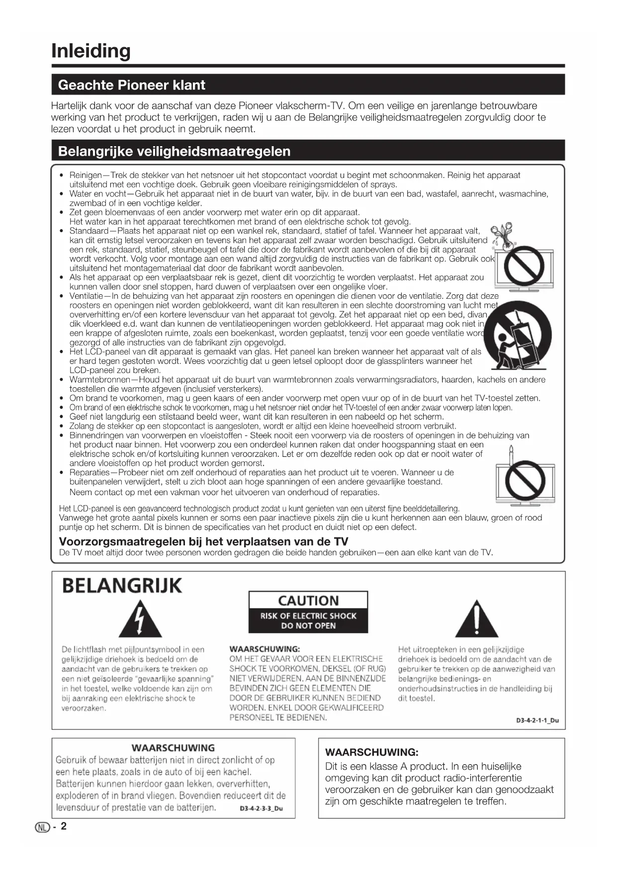 Hartelijk dank voor de aanschaf van deze Pioneer vlakscherm-TV. Om een veilige en jarenlange betrouwbare