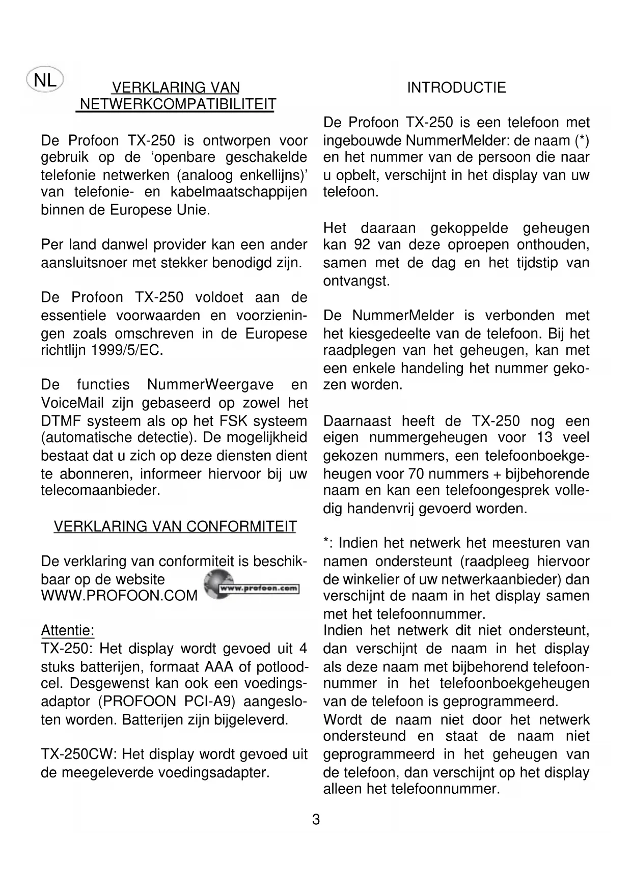 NETWERKCOMPATIBILITEIT De Profoon TX-250 is ontworpen voor gebruik op de ‘openbare geschakelde telefonie netwerken (analoog enkellijns)’ van telefonie- en kabelmaatschappijen binnen de Europese Unie. Per land danwel provider kan een ander aansluitsnoer met stekker benodigd zijn. De Profoon TX-250 voldoet aan de essentiele voorwaarden en voorzienin- gen zoals omschreven in de Europese richtlijn 1999/5/EC. De functies NummerWeergave en VoiceMail zijn gebaseerd op zowel het DTMF systeem als op het FSK systeem (automatische detectie). De mogelijkheid bestaat dat u zich op deze diensten dient te abonneren, informeer hiervoor bij uw telecomaanbieder.
