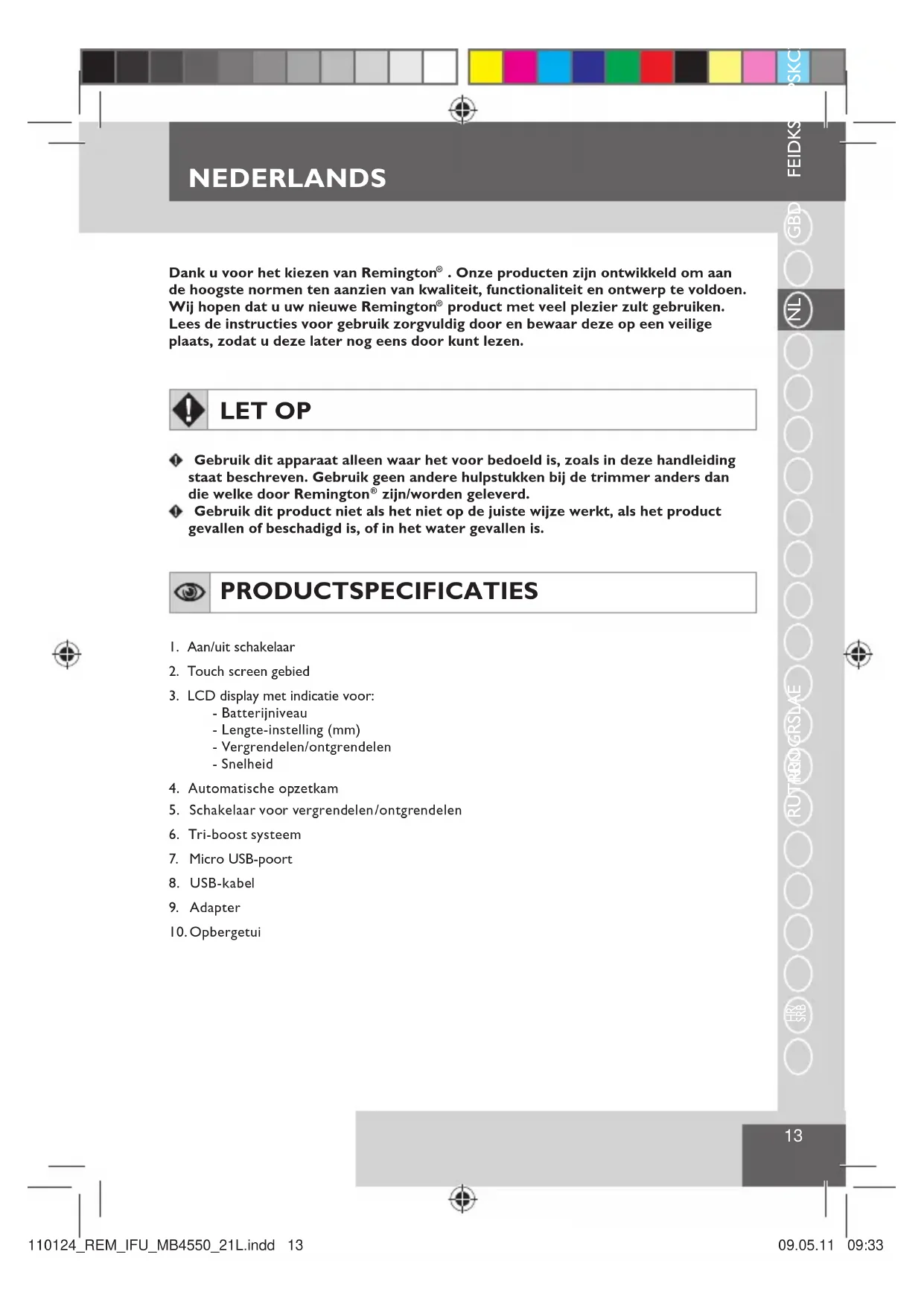 Gebruik dit product niet als het niet op de juiste wijze werkt, als het product gevallen of beschadigd is, of in het water gevallen is. PRODUCTSPECIFICATIES 1. Aan/uit schakelaar2. Touch screen gebied3. LCD display met indicatie voor:- Batterijniveau- Lengte-instelling (mm)- Vergrendelen/ontgrendelen- Snelheid4. Automatische opzetkam 5. Schakelaar voor vergrendelen/ontgrendelen 6. Tri-boost systeem7. Micro USB-poort8. USB-kabel9. Adapter10. Opbergetui110124_REM_IFU_MB4550_21L.indd 13 09.05.11 09:33NEDERLANDS