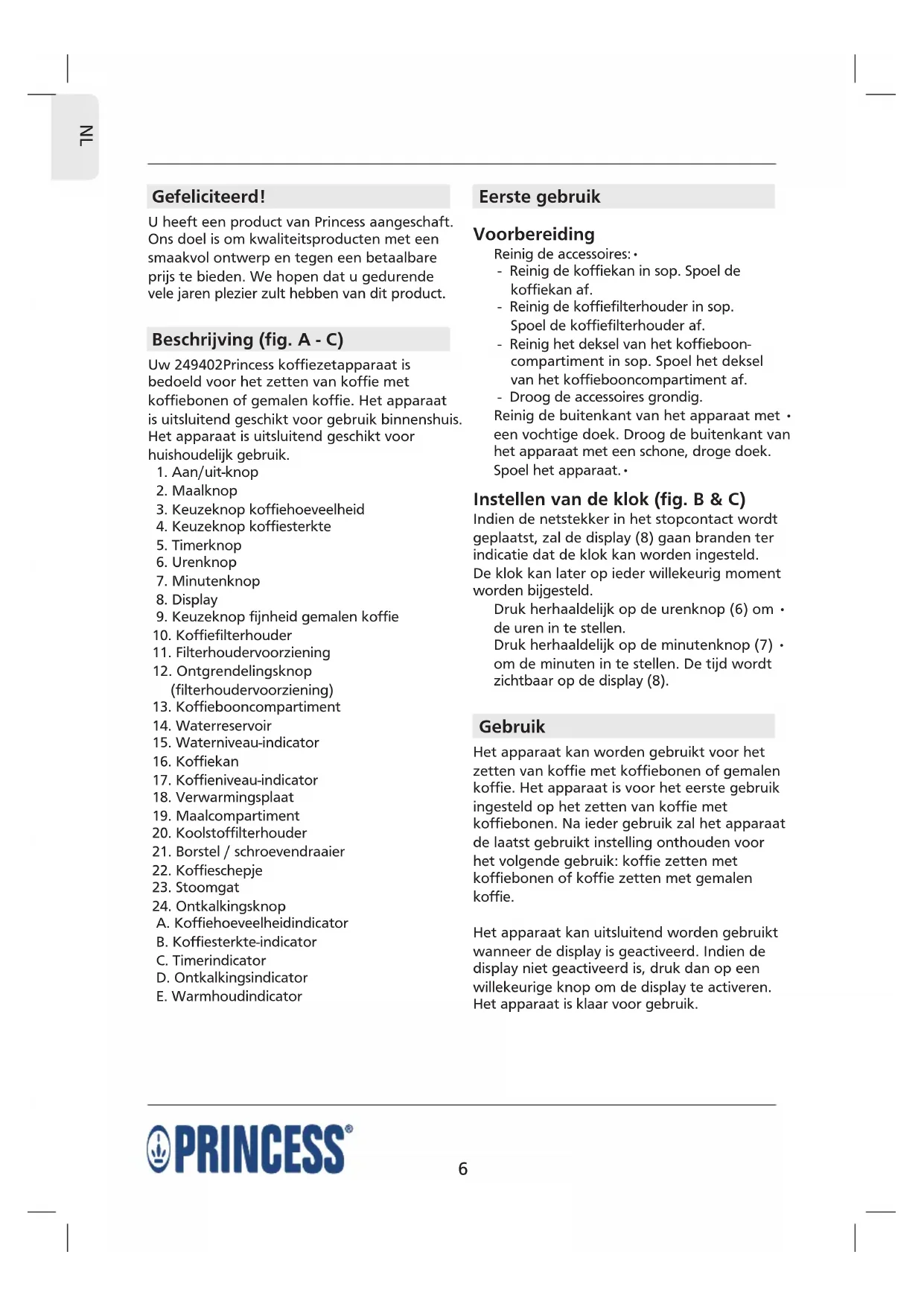 Gefeliciteerd! U heeft een product van Princess aangeschaft. Ons doel is om kwaliteitsproducten met een smaakvol ontwerp en tegen een betaalbare prijs te bieden. We hopen dat u gedurende vele jaren plezier zult hebben van dit product. Beschrijving (fig. A - C) Uw 249402Princess koffiezetapparaat is bedoeld voor het zetten van koffie met koffiebonen of gemalen koffie. Het apparaat is uitsluitend geschikt voor gebruik binnenshuis. Het apparaat is uitsluitend geschikt voor huishoudelijk gebruik.