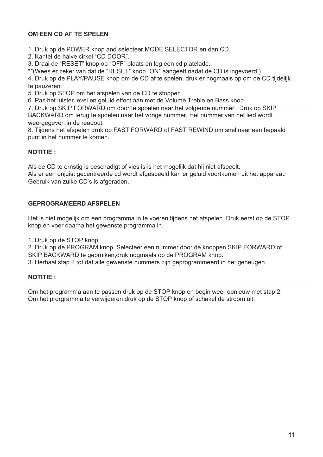 punt in het nummer te komen. NOTITIE : Als de CD te ernstig is beschadigt of vies is is het mogelijk dat hij niet afspeelt. Als er een onjuist gecentreerde cd wordt afgespeeld kan er geluid voortkomen uit het apparaat. Gebruik van zulke CD’s is afgeraden. GEPROGRAMEERD AFSPELEN Het is niet mogelijk om een programma in te voeren tijdens het afspelen. Druk eerst op de STOP knop en voer daarna het gewenste programma in.