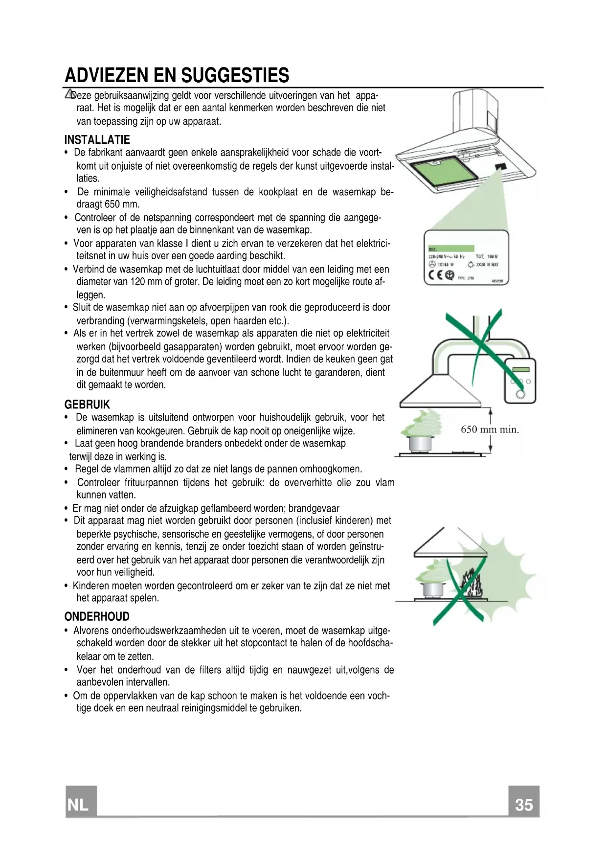 ADVIEZEN EN SUGGESTIES Deze gebruiksaanwijzing geldt voor verschillende uitvoeringen van het appa-raat. Het is mogelijk dat er een aantal kenmerken worden beschreven die niet van toepassing zijn op uw apparaat. INSTALLATIE • De fabrikant aanvaardt geen enkele aansprakelijkheid voor schade die voort-komt uit onjuiste of niet overeenkomstig de regels der kunst uitgevoerde instal-laties. • De minimale veiligheidsafstand tussen de kookplaat en de wasemkap be-draagt 650 mm. • Controleer of de netspanning correspondeert met de spanning die aangege-ven is op het plaatje aan de binnenkant van de wasemkap. • Voor apparaten van klasse I dient u zich ervan te verzekeren dat het elektrici-teitsnet in uw huis over een goede aarding beschikt. • Verbind de wasemkap met de luchtuitlaat door middel van een leiding met een diameter van 120 mm of groter. De leiding moet een zo kort mogelijke route af-leggen. • Sluit de wasemkap niet aan op afvoerpijpen van rook die geproduceerd is door verbranding (verwarmingsketels, open haarden etc.). • Als er in het vertrek zowel de wasemkap als apparaten die niet op elektriciteit werken (bijvoorbeeld gasapparaten) worden gebruikt, moet ervoor worden ge-zorgd dat het vertrek voldoende geventileerd wordt. Indien de keuken geen gat in de buitenmuur heeft om de aanvoer van schone lucht te garanderen, dient dit gemaakt te worden. GEBRUIK • De wasemkap is uitsluitend ontworpen voor huishoudelijk gebruik, voor het elimineren van kookgeuren. Gebruik de kap nooit op oneigenlijke wijze. • Laat geen hoog brandende branders onbedekt onder de wasemkap terwijl deze in werking is. • Regel de vlammen altijd zo dat ze niet langs de pannen omhoogkomen. • Controleer frituurpannen tijdens het gebruik: de oververhitte olie zou vlam kunnen vatten. • Er mag niet onder de afzuigkap geflambeerd worden; brandgevaar • Dit apparaat mag niet worden gebruikt door personen (inclusief kinderen) met beperkte psychische, sensorische en geestelijke vermogens, of door personen zonder ervaring en kennis, tenzij ze onder toezicht staan of worden geïnstru-eerd over het gebruik van het apparaat door personen die verantwoordelijk zijn voor hun veiligheid. • Kinderen moeten worden gecontroleerd om er zeker van te zijn dat ze niet met het apparaat spelen. ONDERHOUD • Alvorens onderhoudswerkzaamheden uit te voeren, moet de wasemkap uitge-schakeld worden door de stekker uit het stopcontact te halen of de hoofdscha-kelaar om te zetten. • Voer het onderhoud van de filters altijd tijdig en nauwgezet uit,volgens de aanbevolen intervallen. • Om de oppervlakken van de kap schoon te maken is het voldoende een voch-tige doek en een neutraal reinigingsmiddel te gebruiken.