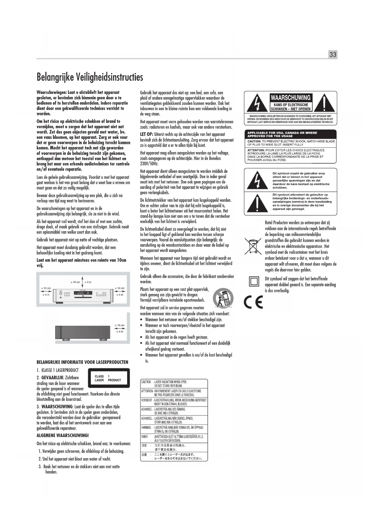 Normalmente, el RCD-1520 muestra el tiempo transcurrido de la pista que se está leyendo. El botón TIME le permite ver visualizaciones de tiempo alternativas. La pulsación de dicho botón una sola vez permite visualizar el tiempo restante de la pista que se esté reproduciendo, que se muestra en sentido decreciente a medida que la misma se va leyendo. La pulsación del botón una segunda vez permite visualizar el tiempo restante de la totalidad del disco (o del programa memorizado). Cuando se seleccionan las visualizaciones de tiempo alternativas, aparece un icono “R” en el visualizador de funciones para confirmarlo. La pulsación del botón una tercera vez permite regresar a la visualización estándar del tiempo transcurrido. NOTA: Cuando reproduzca discos con archivos MP3 o WMA, el visualizador de funciones solamente podrá mostrar el tiempo transcurrido y el tiempo restante de la pista en curso de lectura. Problemas y Posibles Soluciones La mayoría de dificultades que suelen producirse en los sistemas de audio son el resultado de conexiones realizadas incorrectamente o ajustes inapropiados. En caso de que usted se encuentre con algún problema, aísle en primer lugar el área afectada, compruebe los ajustes de control realizados, determine la causa del fallo y haga los cambios necesarios. Si se ve incapaz de hacer funcionar de nuevo el RCD-1520, considere las sugerencias que le damos para las siguientes condiciones: El Indicador Luminoso de Puesta en Marcha No Se Activa El Indicador Luminoso de Puesta en Marcha y los iconos básicos del Visualizador de Funciones deberían activarse en el momento de conectar el RCD-1520 a una toma de corriente eléctrica y pulsar el botón POWER. Si no es así, compruebe dicha toma con otro dispositivo eléctrico, como por ejemplo una bombilla, y asegúrese de que la misma no esté controlada por un conmutador situado en su posición off. Sustitución del Fusible En el caso de que otro dispositivo eléctrico conectado a la toma anterior funcione correctamente pero el indicador luminoso de puesta en marcha y el Visualizador de Funciones del RCD-1520 sigan sin activarse cuando este último esté conectado a dicha toma, significa que es muy posible que el fusible de protección interno del aparato se haya fundido. Si usted cree que ha sucedido esto, contacte con su distribuidor Rotel autorizado para que le proporcione un nuevo fusible y se lo instale adecuadamente. No Hay Sonido Verifique los cables que unen el RCD-1520 al amplificador integrado o preamplificador y compruebe que estén conectados adecuadamente. Asegúrese de que se haya seleccionado la entrada correcta en el amplificador integrado o preamplificador. Compruebe el cableado entre el amplificador integrado o etapa de potencia y las cajas acústicas.33 Waarschuwingen: Laat u alstublieft het apparaat gesloten, er bevinden zich binnenin geen door u te bedienen of te herstellen onderdelen. Iedere reparatie dient door een gekwalificeerde technicus verricht te worden. Om het risico op elektrische schokken of brand te vermijden, moet u zorgen dat het apparaat niet nat wordt. Zet dus geen objecten gevuld met water, bv. een vaas bloemen, op het apparaat. Zorg er ook voor dat er geen voorwerpen in de behuizing terecht kunnen komen. Mocht het apparaat toch nat zijn geworden of voorwerpen in de behuizing terecht zijn gekomen, ontkoppel dan meteen het toestel van het lichtnet en breng het naar een erkende audiotechnicus ter controle en/of eventuele reparatie. Lees de gehele gebruiksaanwijzing. Voordat u met het apparaat gaat werken is het van groot belang dat u weet hoe u ermee om moet gaan en dat zo veilig mogelijk. Bewaar deze gebruiksaanwijzing op een plek, die u zich na verloop van tijd nog weet te herinneren. De waarschuwingen op het apparaat en in de gebruiksaanwijzing zijn belangrijk, sla ze niet in de wind. Als het apparaat vuil wordt, stof het dan af met een zachte, droge doek, of maak gebruik van een stofzuiger. Gebruik nooit een oplosmiddel van welke soort dan ook. Gebruik het apparaat niet op natte of vochtige plaatsen. Het apparaat moet dusdanig gebruikt worden, dat een behoorlijke koeling niet in het gedrang komt. Laat om het apparaat minstens een ruimte van 10cm vrij. Rotel Producten worden zo ontworpen dat zij voldoen aan de internationale regels betreffende de beperking van milieuonvriendelijke grondstoffen die gebruikt kunnen worden in elektrische en elektronische apparatuur. Het symbool met de vuilcontainer met het kruis erdoor betekent voor u dat u, wanneer u dit apparaat wilt afvoeren, dit moet doen volgens de regels die daarvoor hier gelden. Dit symbool wil zeggen dat het betreffende apparaat dubbel geaard is. Een separate aarding is dus overbodig. Belangrijke Veiligheidsinstructies Gebruik het apparaat dus niet op: een bed, een sofa, een plaid of andere onregelmatige oppervlakken waardoor de ventilatiegaten geblokkeerd zouden kunnen worden. Ook het inbouwen in een te kleine ruimte kan een voldoende koeling in de weg staan. Het apparaat moet verre gehouden worden van warmtebronnen zoals: radiatoren en kachels, maar ook van andere versterkers. LET OP: Uiterst rechts op de achterzijde van het apparaat bevindt zich de lichtnetaansluiting. Zorg ervoor dat het apparaat zo is opgesteld dat u er te allen tijde bij kunt. Het apparaat mag alleen aangesloten worden op het voltage, zoals aangegeven op de achterzijde. Hier in de Benelux 230V/50Hz. Het apparaat dient alleen aangesloten te worden middels de bijgeleverde netkabel of een soortgelijk. Doe in ieder geval nooit iets met het netsnoer. Doe ook geen pogingen om de aarding of polariteit van het apparaat te wijzigen en gebruik geen verlengkabels. De lichtnetstekker van het apparaat kan losgekoppeld worden. Om er echter zeker van te zijn dat hij echt losgekoppeld is, kunt u beter het lichtnetsnoer uit het muurcontact halen. Het stand-by lampje kan niet aan om u te tonen dat de versterker werkelijk van het lichtnet is verwijderd. De l