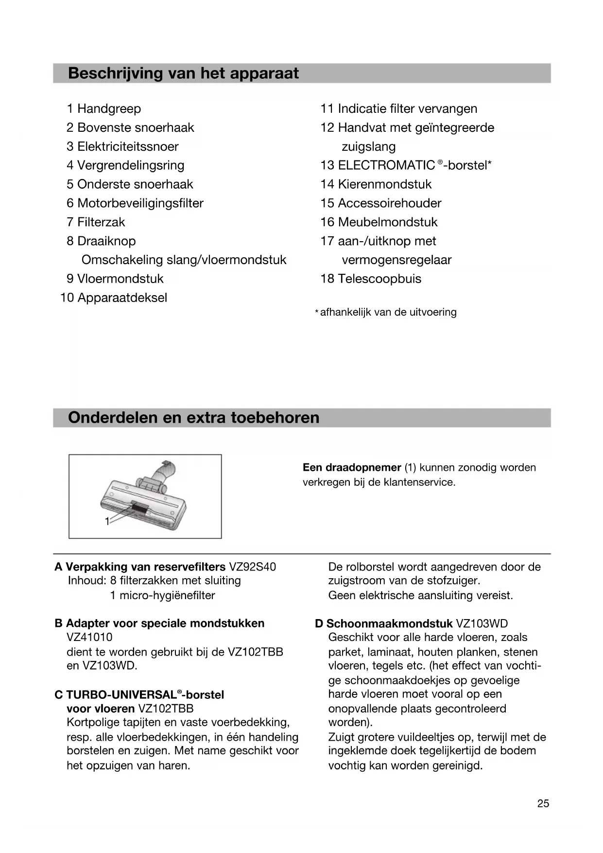 stofzuiger uitvoeren en onderdelen