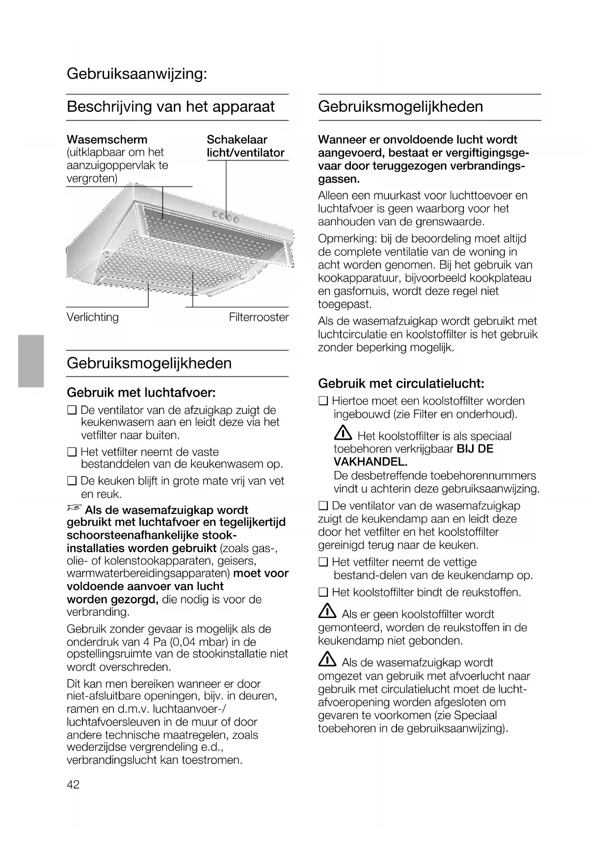 Gebruiksmogelijkheden Wanneer er onvoldoende lucht wordtaangevoerd, bestaat er vergiftigingsge-vaar door teruggezogen verbrandings-gassen.Alleen een muurkast voor luchttoevoer enluchtafvoer is geen waarborg voor het aanhouden van de grenswaarde.Opmerking: bij de beoordeling moet altijdde complete ventilatie van de woning inacht worden genomen. Bij het gebruik vankookapparatuur, bijvoorbeeld kookplateauen gasfornuis, wordt deze regel niettoegepast.Als de wasemafzuigkap wordt gebruikt metluchtcirculatie en koolstoffilter is het gebruikzonder beperking mogelijk. Gebruik met circulatielucht: ❑ Hiertoe moet een koolstoffilter wordeningebouwd (zie Filter en onderhoud). Het koolstoffilter is als speciaal toebehoren verkrijgbaar BIJ DE VAKHANDEL.De desbetreffende toebehorennummersvindt u achterin deze gebruiksaanwijzing.❑ De ventilator van de wasemafzuigkapzuigt de keukendamp aan en leidt dezedoor het vetfilter en het koolstoffilter gereinigd terug naar de keuken.❑ Het vetfilter neemt de vettige bestand-delen van de keukendamp op.❑ Het koolstoffilter bindt de reukstoffen. Als er geen koolstoffilter wordt gemonteerd, worden de reukstoffen in dekeukendamp niet gebonden. Als de wasemafzuigkap wordt omgezet van gebruik met afvoerlucht naargebruik met circulatielucht moet de lucht-afvoeropening worden afgesloten om gevaren te voorkomen (zie Speciaal toebehoren in de gebruiksaanwijzing) . VerlichtingSchakelaarlicht/ventilatorFilterroosterWasemscherm(uitklapbaar om het aanzuigoppervlak te vergroten) Beschrijving van het apparaat