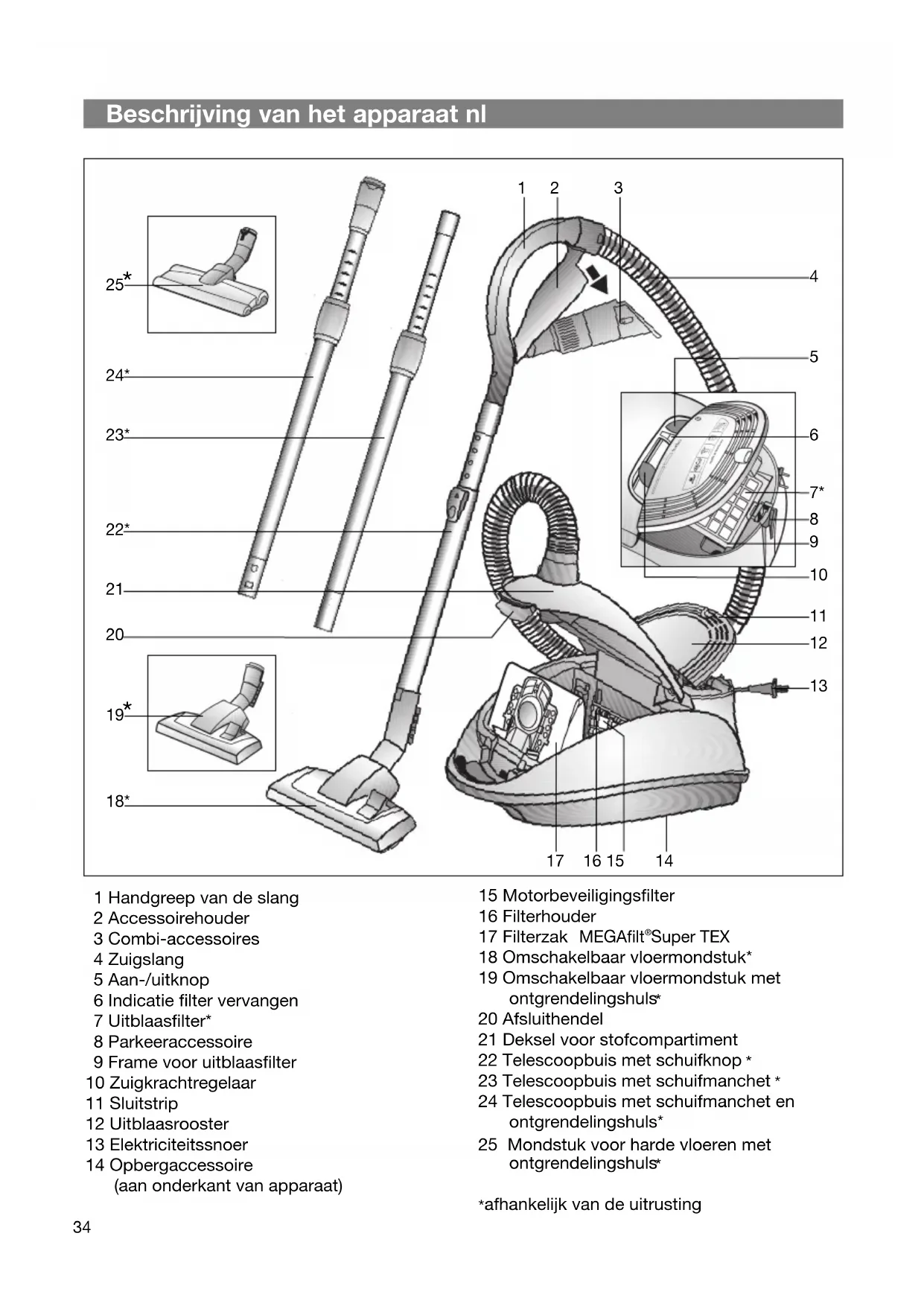 De stofzuiger en de accessoires van