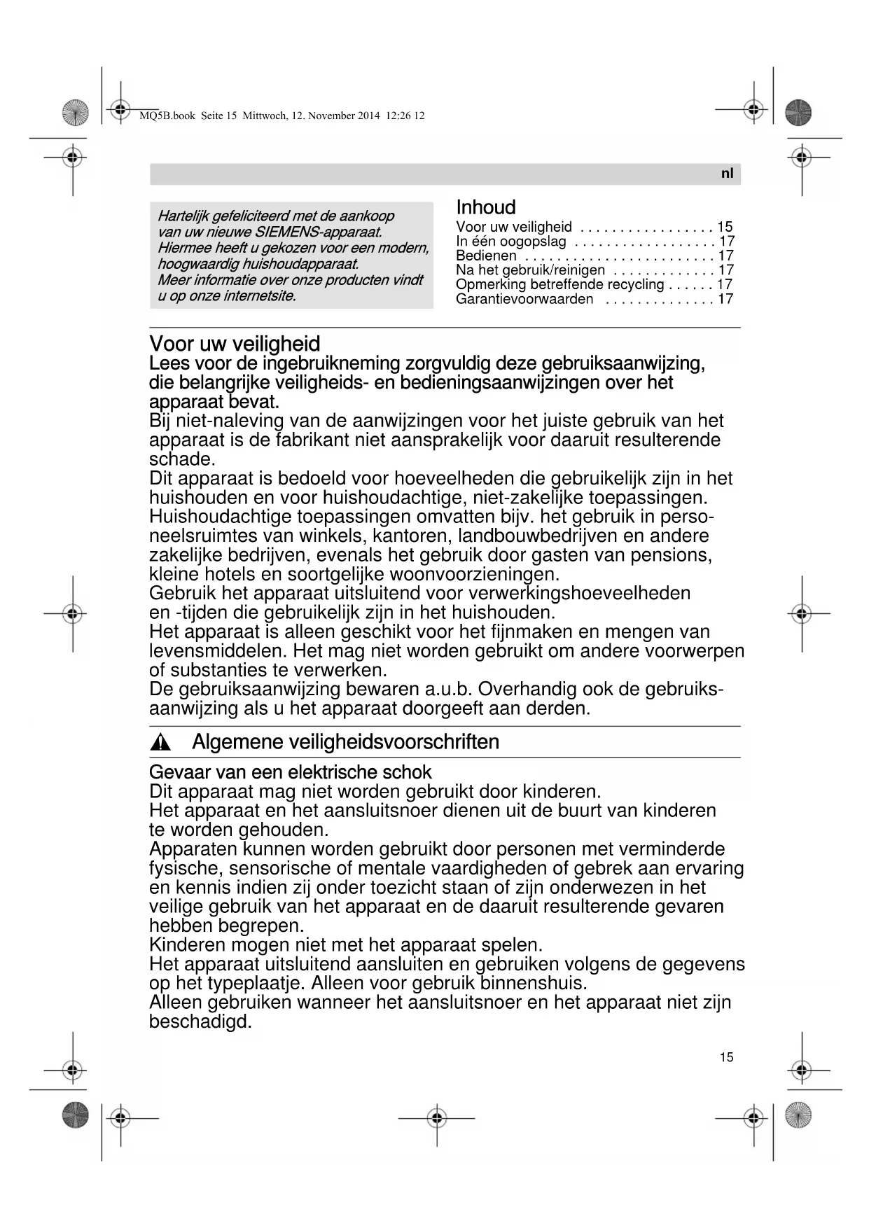 Inhoud Voor uw veiligheid . . . . . . . . . . . . . . . . . 15In één oogopslag . . . . . . . . . . . . . . . . . . 17Bedienen . . . . . . . . . . . . . . . . . . . . . . . . 17Na het gebruik/reinigen . . . . . . . . . . . . . 17Opmerking betreffende recycling . . . . . . 17Garantievoorwaarden . . . . . . . . . . . . . . 17 Voor uw veiligheid