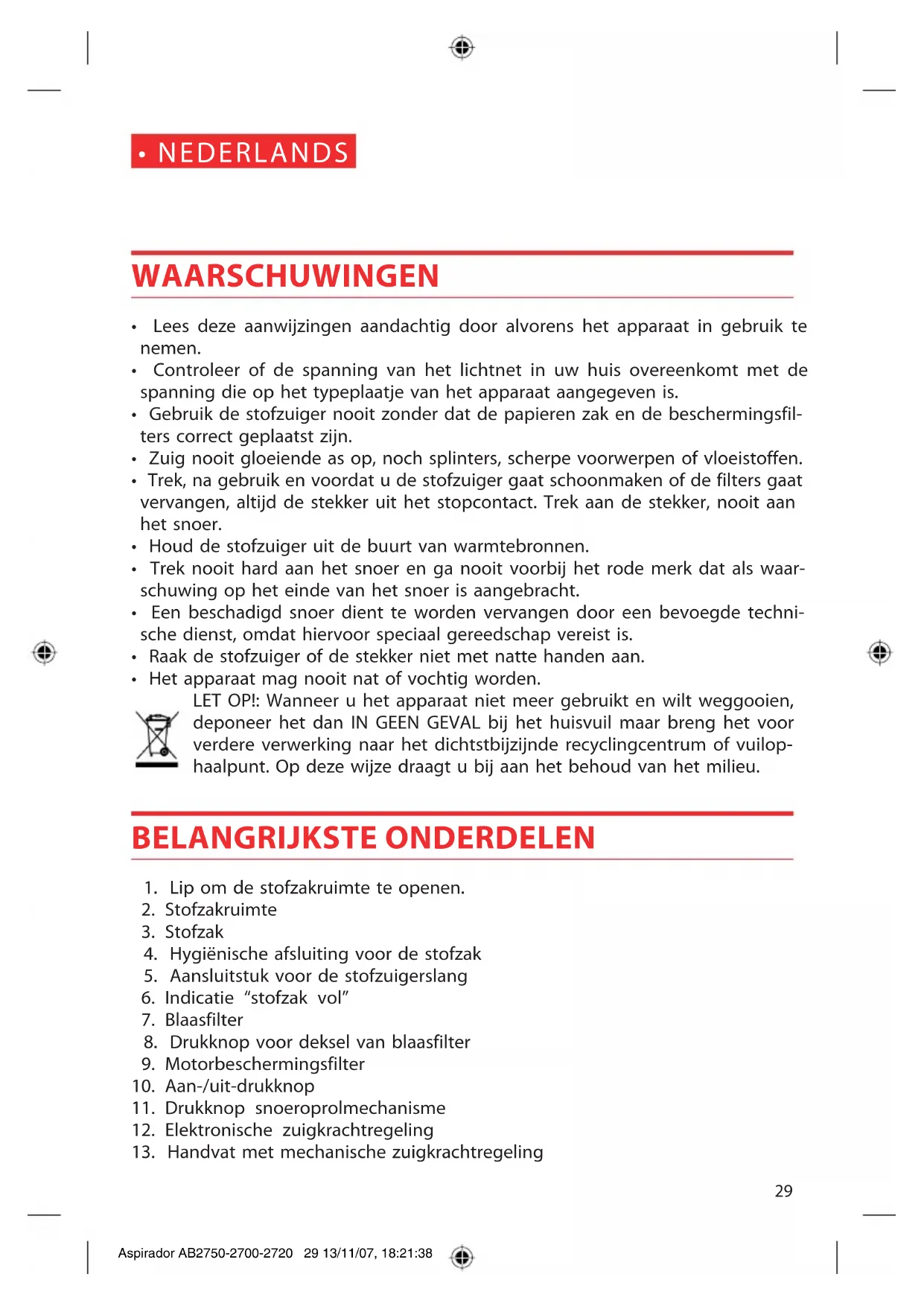 - Stel het vermogen in met de zuigkrachtregeling (12). Aspirador AB2750-2700-2720 30 13/11/07, 18:21:3931