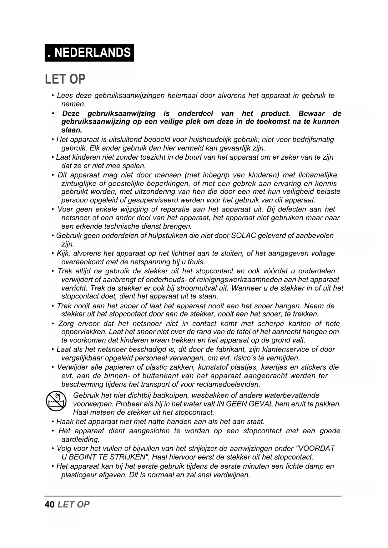 , Verwijder eerst de beschermlaag van de strijkzool, voordat u begint te strijken. , In verband met de hoge hardheid van het leidingwater in bepaalde gebieden beveelt Solac aan altijd gedemineraliseerd water te gebruiken om te strijken. Op deze manier zal uw strijkijzer langer optimaal blijven werken. , Als u om enigerlei reden geen gedemineraliseerd water kunt vinden, gebruik dan in elk geval mineraalarm (zacht) water, of filter het leidingwater met een waterfilterkan. , Gebruik geen ontkalkingsmiddelen of antikalkmiddelen in het waterreservoir. Gebruik evenmin geparfumeerd water of strijkwater. Deze producten kunnen hetstoomsysteem van binnen beschadigen.1 Trek de stekker uit het stopcontact en zet de stoomregelaar (10) in de stand Gesloten (Afb. 2).2 Open de vulmond (5). Vul het waterreservoir met behulp van de meegeleverde beker(12) zonder de bovenste markering te overschrijden. Houd het strijkijzer hierbijhorizontaal (Afb. 1). Sluit de dop wanneer het waterreservoir vol is. ) Let er bij het vullen van het reservoir op dat er geen water over de rand van de vulmond loopt.3 Controleer of het strijkgoed een etiket heeft met de temperatuurgegevens voor hetstrijken.1Romp2 Netsnoer3 Metalen strijkzool4 Sproeibuisstuk5Vulmond6 Waterreservoir7 Sproeiknop8 Superstoomknop9 Temperatuurregelaar10 Stoomafgifteregelaar/zelfreiniging11 Controlelampje Opwarmen12* Vulbeker (alleen model PV2210)42 GEBRUIK ) Aanbevolen wordt eerst het wasgoed te sorteren al naar gelang de temperatuur die voor het strijken vereist is en met de kledingstukken te beginnen waarvoor de laagste temperatuur ( • ) verlangd wordt. , LET OP: Door fijne kledingstukken te strijken met een hogere temperatuur dan vereist, wordt het weefsel beschadigd en blijven er bovendien verbrande deeltjes aan de zoolplaat vastkleven. , Als u twijfels heeft over de temperatuur die u voor een bepaald kledingstuk moet toepassen, probeer het dan uit op een onzichtbaar deel ervan. Begin met de laagste temperatuur en voer deze geleidelijk op. GEBRUIK ) Dit apparaat is uitsluitend ontworpen om kleding te strijken. Gebruik het niet voor andere doeleinden. ) Verwijder alle transport- en verpakkingselementen in hun geheel. n Ga voorzichtig om met het apparaat als het heet is en raak dan de metalen strijkzool niet aan. n Laat het hete strijkijzer nooit met de strijkzool in horizontale stand staan. Laat het strijkijzer rusten op de achterkant. n Wees voorzichtig met de stoom. Richt deze niet op personen, dieren, of kwetsbare voorwerpen. n Strijk altijd op een stabiel, stevig en glad oppervlak. ) Voor zeer fijne kledingstukken kunt u van een doek gebruikmaken die u tussen het strijkijzer en het kledingstuk legt om eventuele sporen van de strijkzool te voorkomen. 1 Rol het netsnoer helemaal uit en doe de stekker in het stopcontact. Het controlelampje Opwarmen (11) gaat branden. Zet het apparaat rechtop. 2 Stel de gewenste strijktemperatuur in voor het wasgoed dat u gaat strijken (zie onder "TEMPERATUURINSTELLINGEN (Afb. 4)” ). 3 Selecteer, naar wens, strijken met stoom (gemiddeld of maximum ) of strijken zonder stoom (zie “STOOMREGELING”). 4 Houd het strijkijzer bij het handvat vast en beweeg de strijkzool over het te strijken kledingsstuk. 5 Als u klaar bent met strijken, zet dan de stoomregelaar (10) in de stand Gesloten en de temperatuurregelaar (9) op stand 0. 6 Haal het netsnoer uit het stopcontact. 7 Leeg het waterreservoir (zie "HET WATERRESERVOIR LEGEN"). Wacht tot het strijkijzer helemaal is afgekoeld en bewaar het rechtop op een veilige plek.