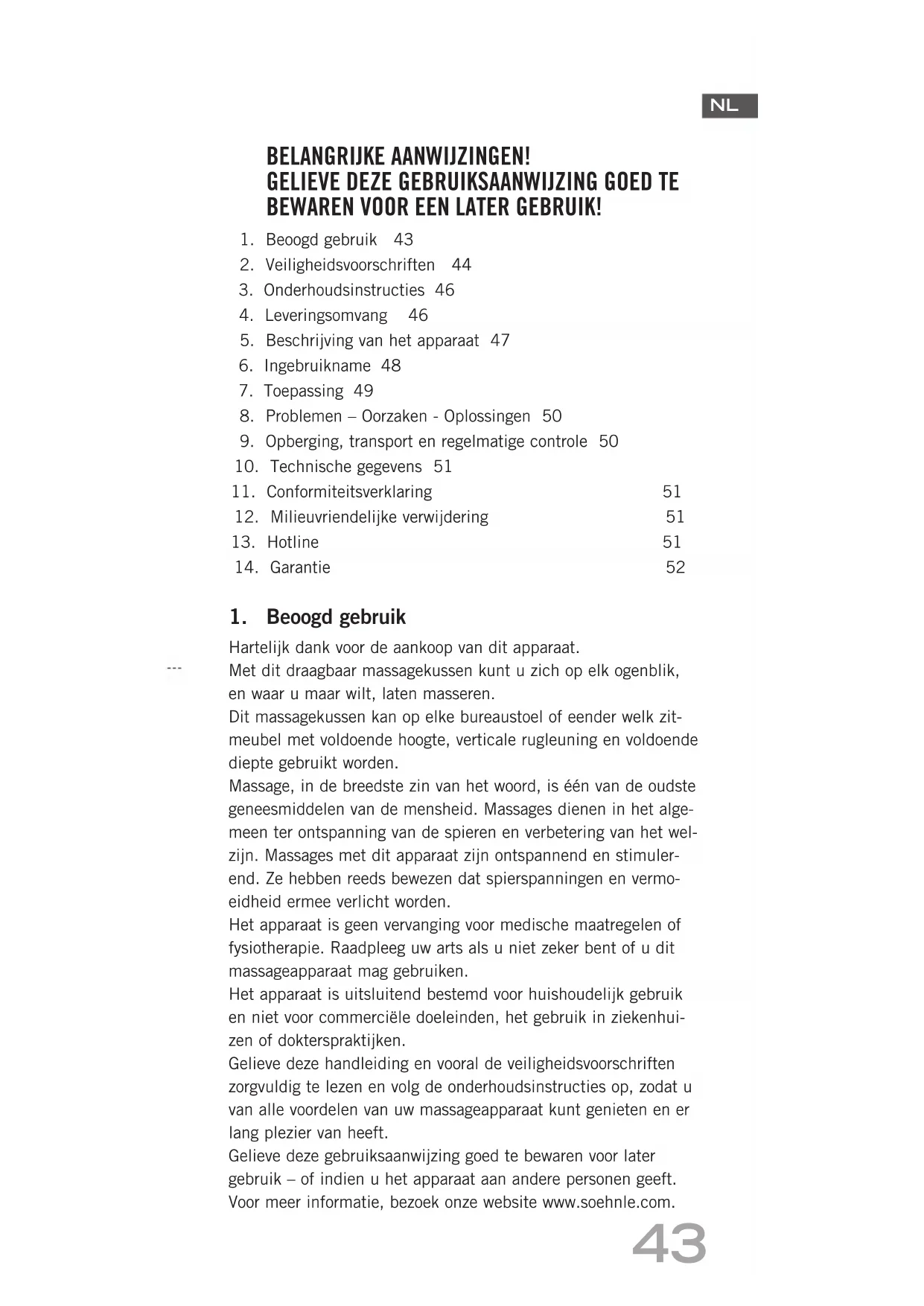 Hartelijk dank voor de aankoop van dit apparaat. Met dit draagbaar massagekussen kunt u zich op elk ogenblik, en waar u maar wilt, laten masseren. Dit massagekussen kan op elke bureaustoel of eender welk zit- meubel met voldoende hoogte, verticale rugleuning en voldoende diepte gebruikt worden. Massage, in de breedste zin van het woord, is één van de oudste geneesmiddelen van de mensheid. Massages dienen in het alge- meen ter ontspanning van de spieren en verbetering van het wel- zijn. Massages met dit apparaat zijn ontspannend en stimuler- end. Ze hebben reeds bewezen dat spierspanningen en vermo- eidheid ermee verlicht worden. Het apparaat is geen vervanging voor medische maatregelen of fysiotherapie. Raadpleeg uw arts als u niet zeker bent of u dit massageapparaat mag gebruiken. Het apparaat is uitsluitend bestemd voor huishoudelijk gebruik en niet voor commerciële doeleinden, het gebruik in ziekenhui- zen of dokterspraktijken. Gelieve deze handleiding en vooral de veiligheidsvoorschriften zorgvuldig te lezen en volg de onderhoudsinstructies op, zodat u van alle voordelen van uw massageapparaat kunt genieten en er lang plezier van heeft. Gelieve deze gebruiksaanwijzing goed te bewaren voor later gebruik – of indien u het apparaat aan andere personen geeft. Voor meer informatie, bezoek onze website www.soehnle.com. BELANGRIJKE AANWIJZINGEN!