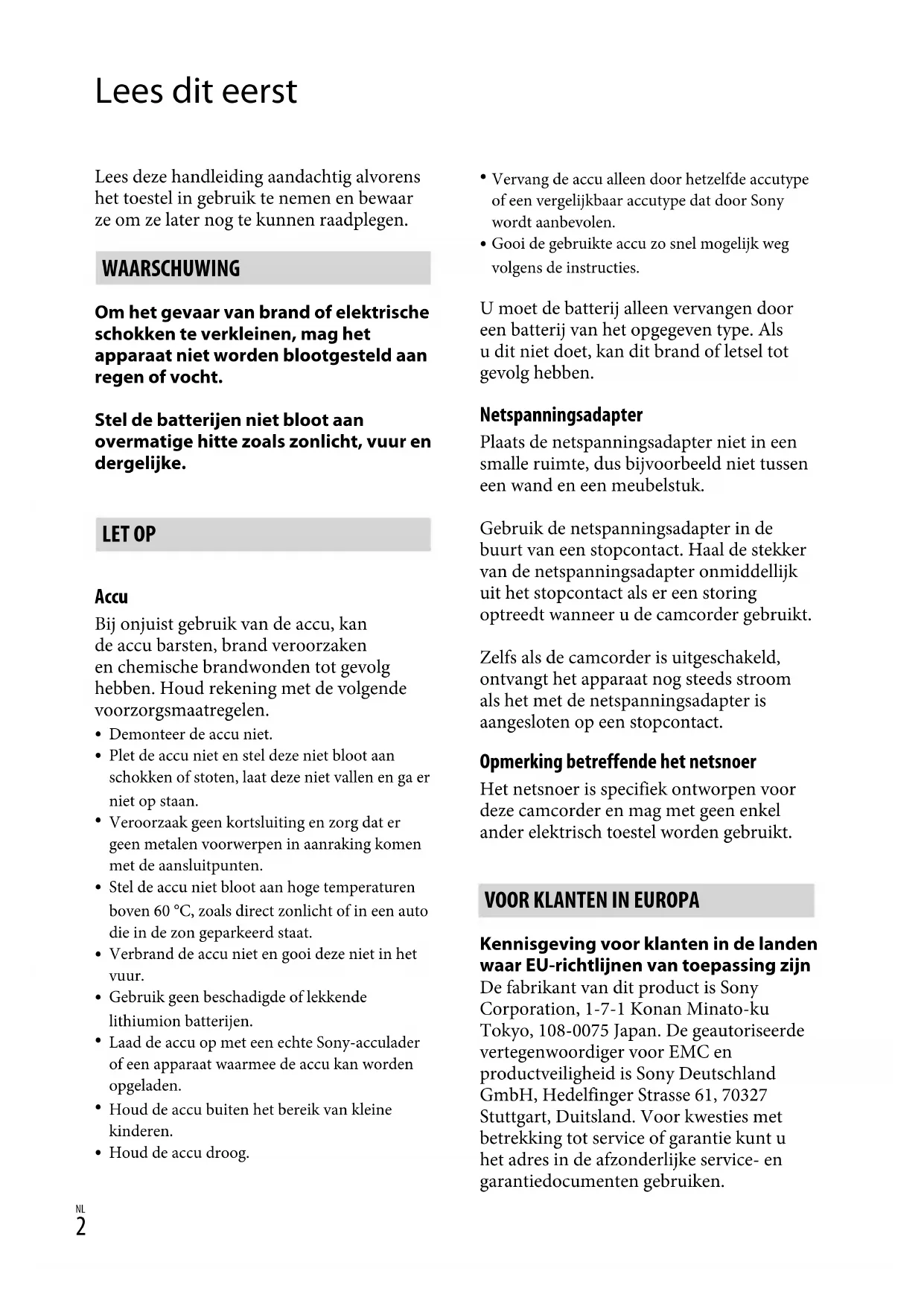 voorzorgsmaatregelen. Demonteer de accu niet.Plet de accu niet en stel deze niet bloot aan schokken of stoten, laat deze niet vallen en ga er niet op staan.Veroorzaak geen kortsluiting en zorg dat er geen metalen voorwerpen in aanraking komen met de aansluitpunten.Stel de accu niet bloot aan hoge temperaturen boven 60 °C, zoals direct zonlicht of in een auto die in de zon geparkeerd staat.Verbrand de accu niet en gooi deze niet in het vuur.Gebruik geen beschadigde of lekkende lithiumion batterijen.Laad de accu op met een echte Sony-acculader of een apparaat waarmee de accu kan worden opgeladen.Houd de accu buiten het bereik van kleine kinderen.Houd de accu droog.