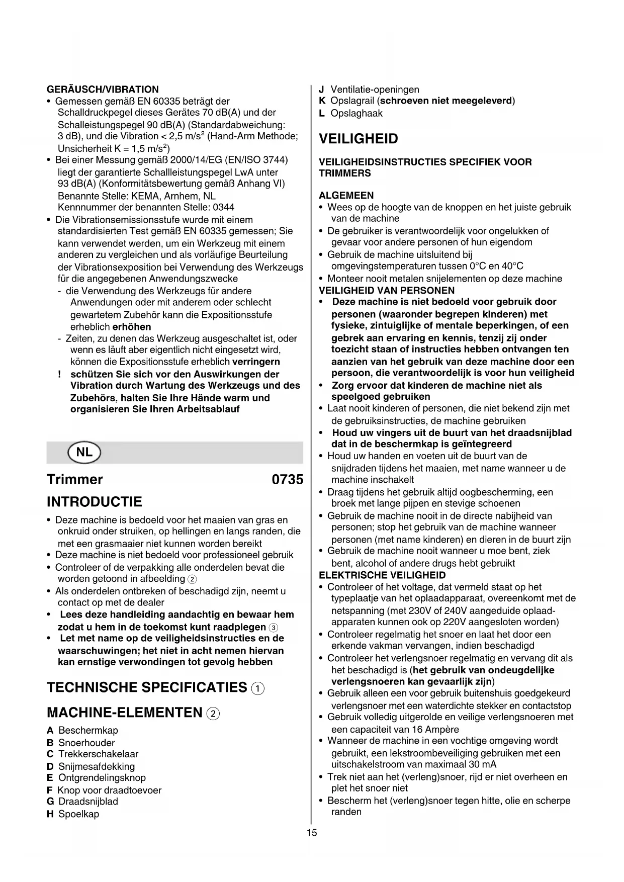 - Letmetnameopdeveiligheidsinstructiesende waarschuwingen;hetnietinachtnemenhiervan kanernstigeverwondingentotgevolghebben TECHNISCHESPECIFICATIES1 MACHINE-ELEMENTEN2 A Beschermkap B Snoerhouder C Trekkerschakelaar D Snijmesafdekking E Ontgrendelingsknop F Knop voor draadtoevoer G Draadsnijblad H Spoelkap J Ventilatie-openingen K Opslagrail (schroevennietmeegeleverd) L Opslaghaak VEILIGHEID VEILIGHEIDSINSTRUCTIESSPECIFIEKVOOR TRIMMERS ALGEMEEN