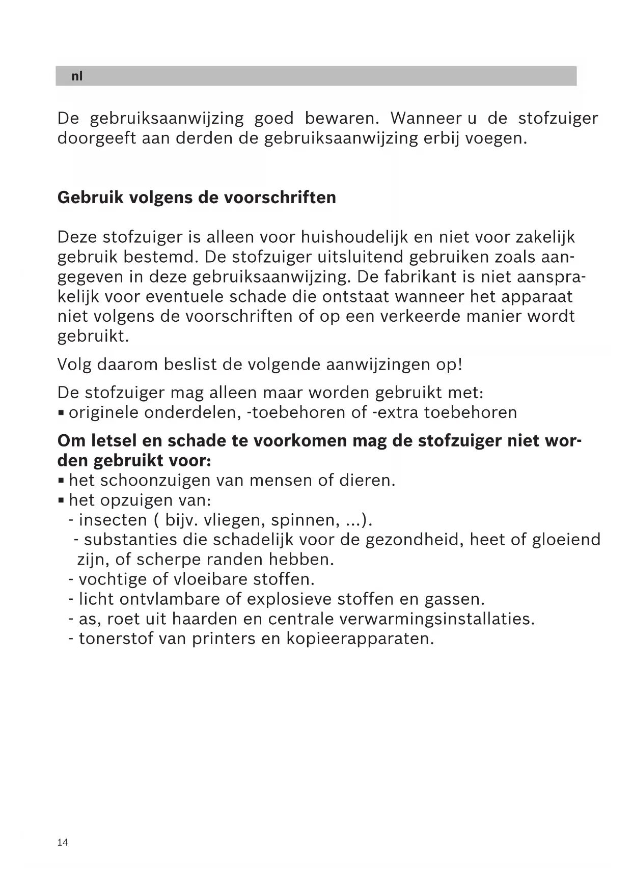 De gebruiksaanwijzing goed bewaren. Wanneer u de stofzuiger doorgeeft aan derden de gebruiksaanwijzing erbij voegen. Gebruik volgens de voorschriften Deze stofzuiger is alleen voor huishoudelijk en niet voor zakelijk gebruik bestemd. De stofzuiger uitsluitend gebruiken zoals aan- gegeven in deze gebruiksaanwijzing. De fabrikant is niet aanspra- kelijk voor eventuele schade die ontstaat wanneer het apparaat niet volgens de voorschriften of op een verkeerde manier wordt gebruikt. Volg daarom beslist de volgende aanwijzingen op! De stofzuiger mag alleen maar worden gebruikt met: originele onderdelen, -toebehoren of -extra toebehoren Om letsel en schade te voorkomen mag de stofzuiger niet wor- den gebruikt voor: het schoonzuigen van mensen of dieren. het opzuigen van: - insecten ( bijv. vliegen, spinnen, ...). - substanties die schadelijk voor de gezondheid, heet of gloeiend zijn, of scherpe randen hebben. - vochtige of vloeibare stoffen. - licht ontvlambare of explosieve stoffen en gassen. - as, roet uit haarden en centrale verwarmingsinstallaties. - tonerstof van printers en kopieerapparaten.de
