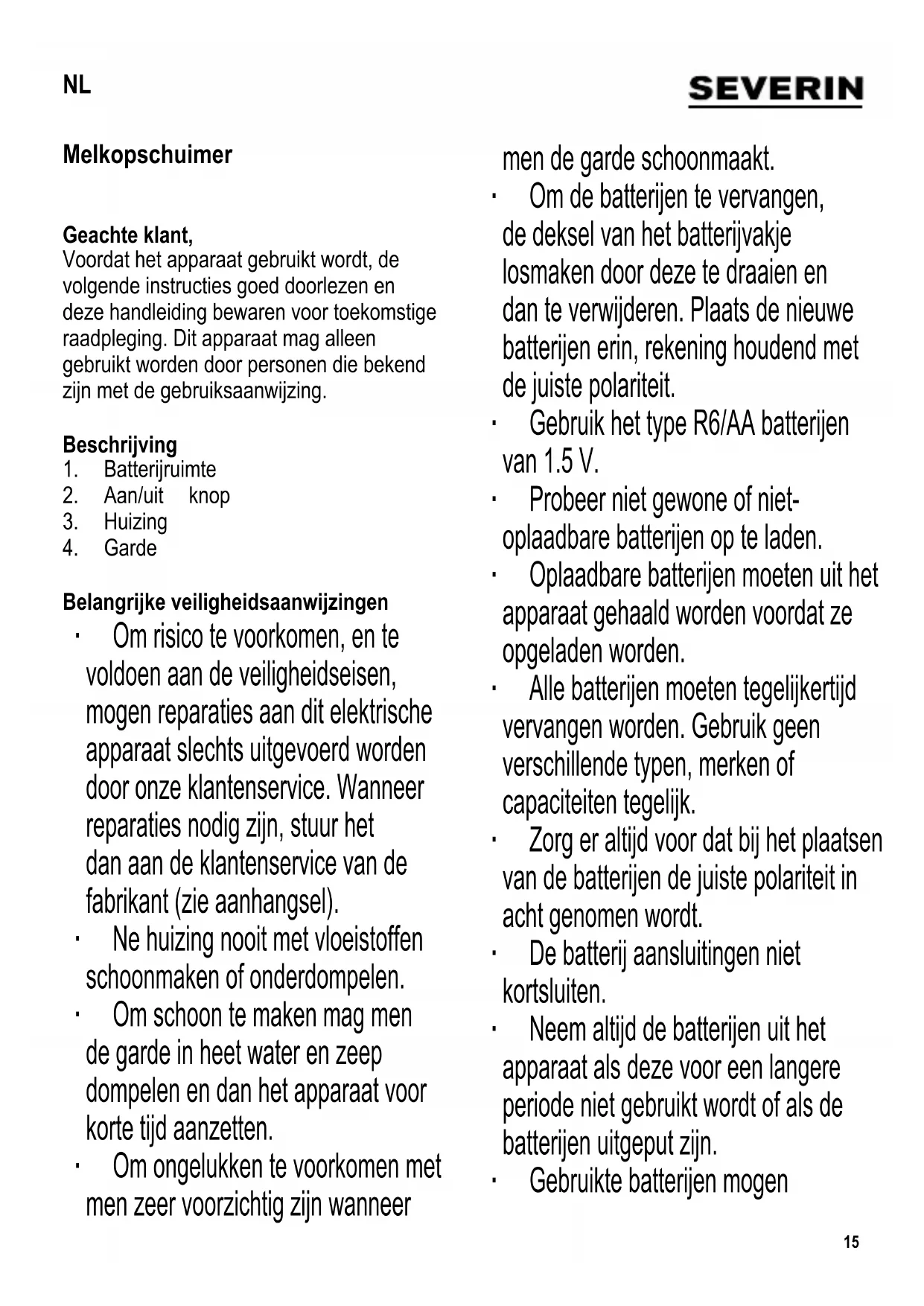 Belangrijke veiligheidsaanwijzingen ∙ Om risico te voorkomen, en te voldoen aan de veiligheidseisen, mogen reparaties aan dit elektrische apparaat slechts uitgevoerd worden door onze klantenservice. Wanneer reparaties nodig zijn, stuur het dan aan de klantenservice van de fabrikant (zie aanhangsel). ∙ Ne huizing nooit met vloeistoffen schoonmaken of onderdompelen. ∙ Om schoon te maken mag men de garde in heet water en zeep dompelen en dan het apparaat voor korte tijd aanzetten. ∙ Om ongelukken te voorkomen met men zeer voorzichtig zijn wanneer men de garde schoonmaakt. ∙ Om de batterijen te vervangen, de deksel van het batterijvakje losmaken door deze te draaien en dan te verwijderen. Plaats de nieuwe batterijen erin, rekening houdend met de juiste polariteit. ∙ Gebruik het type R6/AA batterijen van 1.5 V. ∙ Probeer niet gewone of niet- oplaadbare batterijen op te laden. ∙ Oplaadbare batterijen moeten uit het apparaat gehaald worden voordat ze opgeladen worden. ∙ Alle batterijen moeten tegelijkertijd vervangen worden. Gebruik geen verschillende typen, merken of capaciteiten tegelijk. ∙ Zorg er altijd voor dat bij het plaatsen van de batterijen de juiste polariteit in acht genomen wordt. ∙ De batterij aansluitingen niet kortsluiten. ∙ Neem altijd de batterijen uit het apparaat als deze voor een langere periode niet gebruikt wordt of als de batterijen uitgeput zijn. ∙ Gebruikte batterijen mogen NL16 niet met het gewone huisvuil weggedaan worden; dit moet via de gemeentelijke inzamelpunten gedaan worden. ∙ Waarschuwing: Verkeert gebruik van dit apparaat kan persoonlijk letsel veroorzaken. ∙ Dit apparaat is bestemd voor huishoudelijk of gelijkwaardig gebruik, zoals - in bedrijfskeukens, in winkels, kantoren of andere bedrijfsruimtes, - in agrarische instellingen, - door klanten in hotels, motels enz. en gelijkwaardige accommodaties, - in bed and breakfast gasthuizen. ∙ Dit apparaat mag gebruikt worden door kinderen (tenminste 8 jaar oud) en door personen met verminderde fysische, zintuiglijke of mentale bekwaamheden, of gebrek van ervaring en kennis, wanneer deze onder begeleiding zijn of instructies ontvangen hebben over het gebruik van dit apparaat en volledig de gevaren en veiligheidsvoorschriften begrijpen. ∙ Kinderen mogen in geen geval dit apparaat schoonmaken of onderhoudswerkzaamheden uitvoeren behalve wanneer onder toezicht van een volwassene en ze tenminste 8 jaar oud zijn. ∙ Het apparaat moet altijd goed weggehouden worden van kinderen jonger dan 8 jaar. ∙ Kinderen mogen niet met het apparaat spelen. ∙ Waarschuwing: Houdt kinderen weg van inpakmateriaal, daar deze een bron van gevaar zijn b.v. door verstikking. ∙ De fabrikant heeft geen verantwoordelijkheid wanneer dit apparaat verkeerd gebruikt word of wanneer de veiligheidsinstructies niet gevolgd worden. ∙ Het apparaat alleen gebruiken wanneer de garde volledig is ondergedompeld in de vloeistof. ∙ Voordat het apparaat wordt gebruikt moet de gehele unit op eventuele defecten gecontroleerd worden. Wanneer het apparaat, bijvoorbeeld op een hard oppervlak is gevallen, of wanneer de as is gebogen, moet men het niet langer gebruiken: zelfs onzichtbare beschadiging kan ongewenste effecten hebben op de gebruiksveiligheid. Batterijen Wanneer het opschuim-proces niet tot de gewenste resultaten leidt, of wanneer u merkt dat de werksnelheid afneemt, betekent dit dat de batterijen vervangen moeten worden. Voor toegang tot de batterijruimte,17 de klep losmaken en verwijderen. Batterijen dienen volgens juiste polariteit geplaatst te worden. Dit apparaat is ontworpen voor gebruik met gewone ‘R6/AA’ 1.5 V batterijen. Voor het beste resultaat, bevelen wij het gebruik van gewone batterijen aan. Het gebruik van oplaadbare batterijen kan een vermindering in melkschuim veroorzaken. Oude batterijen moeten weggegooid worden in de daarvoor bestemde speciale collectiepunten. Voor het eerste gebruik Voordat men het apparaat voor het eerst gebruikt of wanneer men het apparaat voor lange periode niet gebruikt heeft, moet men deze eerst goed schoonmaken zoals staat beschreven in de sectie Onderhoud en schoonmaken. Gebruik Wij adviseren het gebruik van melk met een hoog proteïne gehalte aan. Vul een geschikte houder (bv glas of beker) met melk. ∙ Steek de garde in de houder, en let op dat hij volledig is ondergedompeld, en druk op de knop om hem in te schakelen. Houd hem ingedrukt tot de melk goed is opgeschuimd. Tijdens het opschuimen moet de kop van de garde in een ronddraaiende beweging bewogen te worden. ∙ Gebruik een lepel om het melkschuim over de koffi e te verspreiden. Onderhoud en schoonmaken De garde is permanent bevestigd en kan niet worden verwijderd. Gemakkelijk schoon te maken door het in heet water en zeep te dompelen en even op de startknop te drukken. Droog de kop naderhand goed af. Om veiligheidsredenen kan de buitenkant van het apparaat niet met water of andere vloeistoffen worden behandeld; hij kan worden afgedaan met een iets vochtige doek. Afval weggooien Instrumenten gemerkt met dit symbool moeten apart weggegooit worden van het huishouidelijke afval, daar deze waardevolle materialen bevatten welke men kan recyclen. Juist wegdoen zal het milieu en de menselijke gezondheid beschermen. De plaatselijke autoriteit of handelaar kan daar informatie over geven. Garantieverklaring Voor dit apparaat geldt een garantie van twee jaar na de aankoopdatum voor materiaal- en fabrieksfouten. Uitgesloten van garantie is schade die ontstaan is door het niet in acht nemen van de gebruiksaanwijzing, normale slijtage en zeer breekbare onderdelen als glaskannen etc. Deze garantieverklaring heeft geen invloed op uw wettelijke rechten, en ook niet op uw legale rechten welke men heeft als een consument onder de toepasselijke nationale wetgeving welke de aankoop van goederen beheerst. De garantie vervalt bij reparatie door niet door ons bevoegde instellingen.18 Espumador de leche Estimado Cliente, Antes de 