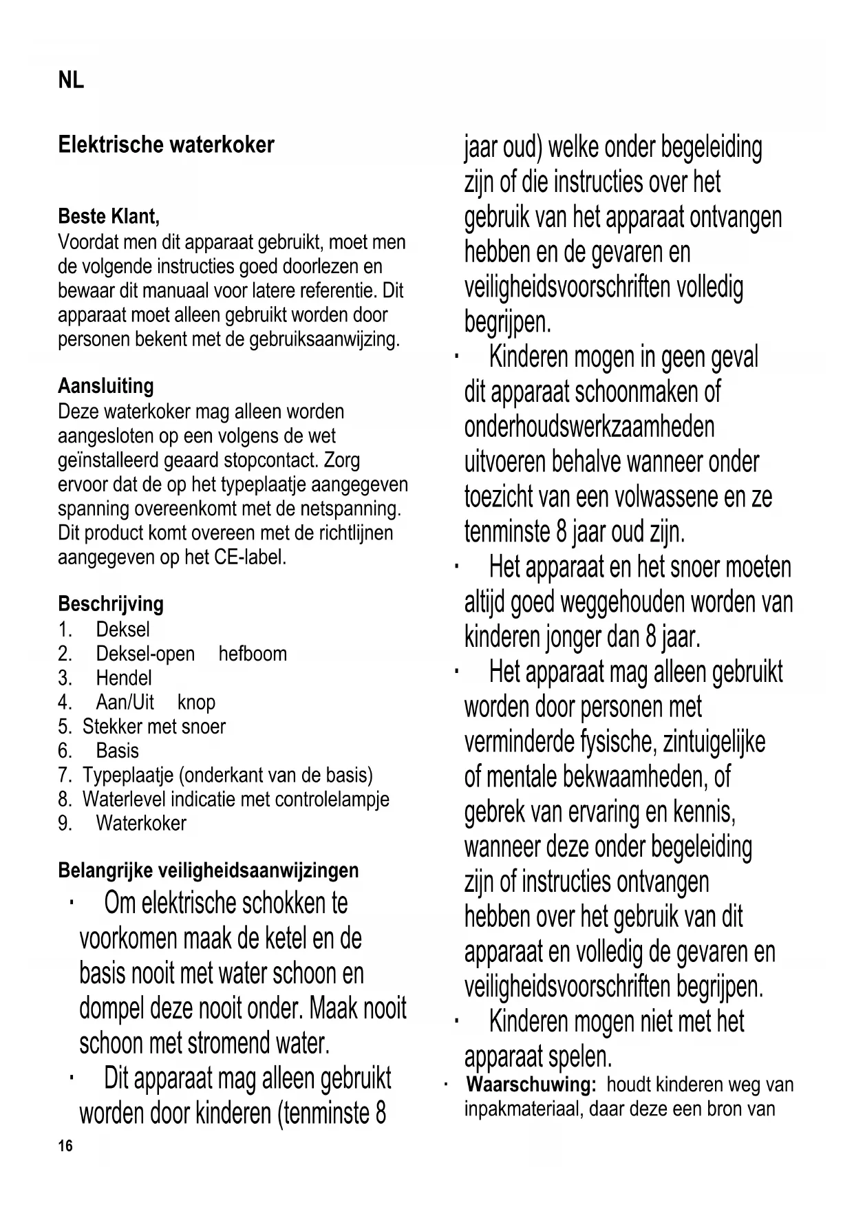 Belangrijke veiligheidsaanwijzingen ∙ Om elektrische schokken te voorkomen maak de ketel en de basis nooit met water schoon en dompel deze nooit onder. Maak nooit schoon met stromend water. ∙ Dit apparaat mag alleen gebruikt worden door kinderen (tenminste 8 jaar oud) welke onder begeleiding zijn of die instructies over het gebruik van het apparaat ontvangen hebben en de gevaren en veiligheidsvoorschriften volledig begrijpen. ∙ Kinderen mogen in geen geval dit apparaat schoonmaken of onderhoudswerkzaamheden uitvoeren behalve wanneer onder toezicht van een volwassene en ze tenminste 8 jaar oud zijn. ∙ Het apparaat en het snoer moeten altijd goed weggehouden worden van kinderen jonger dan 8 jaar. ∙ Het apparaat mag alleen gebruikt worden door personen met verminderde fysische, zintuigelijke of mentale bekwaamheden, of gebrek van ervaring en kennis, wanneer deze onder begeleiding zijn of instructies ontvangen hebben over het gebruik van dit apparaat en volledig de gevaren en veiligheidsvoorschriften begrijpen. ∙ Kinderen mogen niet met het apparaat spelen. ∙ Waarschuwing: houdt kinderen weg van inpakmateriaal, daar deze een bron van NL17 gevaar zijn b.v. door verstikking. ∙ Voordat het apparaat wordt gebruikt moet zowel de hoofdeenheid als gelijk welk hulpstuk, dat wordt aangebracht, eerst zorgvuldig op eventuele defecten worden gecontroleerd. Ingeval het apparaat, bij voorbeeld, op een hard oppervlak is gevallen mag het niet meer worden gebruikt: zelfs onzichtbare beschadiging kan ongewenste effecten hebben op de gebruiksveiligheid van het apparaat. ∙ Het snoer moet regelmatig op eventuele beschadiging worden gecontroleerd. Wanneer een beschadiging wordt geconstateerd mag het apparaat niet meer worden gebruikt. ∙ Niet gebruiken wanneer excessieve kracht is gebruikt om het aansluitsnoer uit de stopcontact te trekken. Schade is niet altijd aan de buitenkant te zien; alvorens het opnieuw wordt gebruikt moet het hele apparaat daarom worden nagekeken door een gekwalifi ceerd monteur. ∙ Laat de waterkoker niet alleen tijdens gebruik; gebruik alleen puur water en let altijd op de maximum/minimum markering wanneer men de waterkoker vult. ∙ Teveel water in de waterkoker kan gevaarlijk zijn vanwege kokend water wat uitgestoten wordt. Pas ook op voor hete stoom die uitgestoten kan worden. Daarom, tijdens gebruik geen enkel ander deel van het apparaat dan de hendelruimte aanraken. ∙ De uitwendige oppervlaktes zullen heet worden tijdens gebruik en zullen voor een lange periode heet blijven. ∙ Attentie: Tijdens het kookproces en als heet water wordt uitgeschonken het deksel te allen tijde gesloten houden. ∙ De waterkoker alleen gebruiken met de bijbehorende sokkel. ∙ Gebruik dit apparaat niet onder overhangende kastjes of gelijkwaardige voorwerpen; er bestaat gevaar dat de stoom welke ontsnapt hieronder gevangen kan blijven. ∙ Gebruik de waterkoker alleen op een hittebestendige vlakke ondergrond. ∙ Zorg ervoor dat het huizing en de snoer niet in contact komen met open vuur of andere hete oppervlaktes zoals kookplaten. ∙ Laat het snoer nooit los hangen en zorg ervoor dat het niet in contact komt met hete delen van de huizing. ∙ Verwijder altijd de stekker uit het stopcontact - na gebruik, - wanneer het apparaat niet werkt, - wanneer men het apparaat schoonmaakt. ∙ Trek de stekker niet aan het snoer uit het stopcontact, trek aan de stekker zelf. ∙ Wordt dit apparaat op een verkeerde manier gebruikt of worden de veiligheidsregels niet gevolgd, dan kan de fabrikant niet aansprakelijk worden gesteld voor eventuele schades. ∙ Dit apparaat is bestemd voor huishoudelijk of gelijkwaardig gebruik, zoals - in winkels, kantoren of andere bedrijfsruimtes, - in agrarische instellingen, - door klanten in hotels, motels enz. en gelijkwaardige etablissementen, - in bed-and breakfast gasthuizen. ∙ Bij de reparatie van elektrische apparaten moeten veiligheidsaspecten in acht genomen worden. Reparaties18 mogen derhalve slechts door erkende vakmensen uitgevoerd worden, zelfs de vervanging van het snoer. Indien dit apparaat kapot is, stuur het dan aan de klantenservice van de fabrikant. Het adres vindt u achterin deze gebruiksaanwijzing. Thermische beveiliging De ingestelde thermische beveiliging beschermt het verhittingelement voor oververhitten wanneer men het apparaat aanzet zonder dat water aanwezig is in de watercontainer of wanneer het element teveel kalkaanslag bevat. Wanneer de thermische beveiliging de waterkoker heeft uitgeschakeld moet men deze voldoende laten afkoelen of men moet de waterkoker ontkalken voordat men deze weer kan aanzetten. Voor het eerste gebruik Om verzekert te zijn van schoon water gooi het eerste gekookte water weg. Water koken ∙ Verwijder de watercontainer van de basis. ∙ Open de deksel en vul de container met water tot het gewenste niveau, houdt hierbij altijd de minimale en maximale markering in de gaten. ∙ Sluit de deksel en plaats de container terug op de basis. ∙ Stop de stekker in het stopcontact en druk op de Aan/Uit schakelaar; het controlelampje op de waterlevel indicatie zal nu aangaan. ∙ Het kookproces zal nu beginnen. Nadat het kookpunt bereikt is zal het apparaat automatisch uitgeschakeld worden door het ingebouwde stoombeveiligingssysteem. Het controlelampje gaat uit. ∙ Om het kookproces te onderbreken, zet de Aan/Uit schakelaar naar de Uit positie. ∙ Om heet water te gieten moet men de container van de basis verwijderen. ∙ Om te voorkomen dat hete stoom wordt uitgestoten zorg ervoor dat de deksel gesloten blijft terwijl men water uitgiet. ∙ Verwijder de stekker na gebruik uit het stopcontact. ∙ Laat nooit water in de container. Snoer opwindruimte De opwindruimte voor het snoer onder de grondplaat limiteert de lengte van het snoer tijdens het gebruikt en vergemakkelijkt het opbergen van het apparaat. Ontkalken Afhangend van de waterkwaliteit in uw omgeving, zal zich kalkaanslag opbouwen op het verhittingelement.