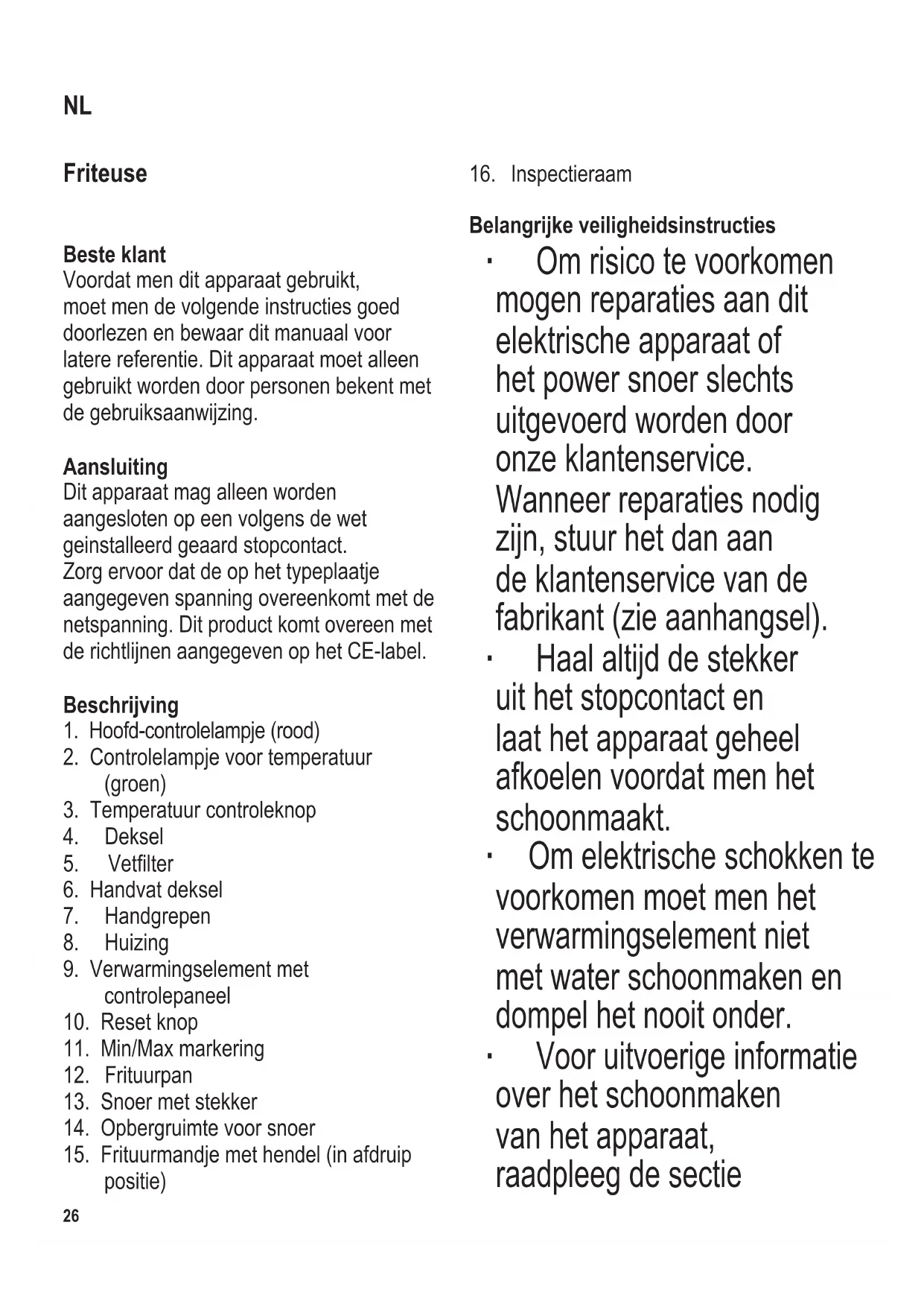 ‚Algemeen onderhoud en schoonmaken‘. ∙ Om gevaren veroorzaakt door het onopzettelijk opnieuw aanzetten van de thermische beveiligingsonderbreker te voorkomen, moet men het apparaat niet gebruiken met externe schakelaars zoals tijdklokken, en tevens moet men het niet aansluiten op een circuit wat regelmatig aan en uitgeschakeld wordt door zulk een devies. ∙ Kinderen onder 8 jaar oud mogen dit apparaat niet gebruiken. ∙ Kinderen ouder dan 8 jaar, echter, mogen dit apparaat gebruiken wanneer onder constante supervisie. ∙ Het apparaat mag alleen gebruikt worden door personen met verminderde fysische, zintuigelijke of mentale bekwaamheden, of gebrek van ervaring en kennis, wanneer deze onder begeleiding zijn of instructies ontvangen hebben over het gebruik van dit apparaat en volledig de gevaren en veiligheidsvoorschriften begrijpen. ∙ Kinderen mogen niet met het apparaat spelen. ∙ Kinderen mogen in geen geval dit apparaat schoonmaken of onderhoudswerkzaamheden uitvoeren. ∙ Waarschuwing! Het apparaat uit de buurt houden van jonge kinderen (0-8 jaar), met name tijdens het gebruik of het afkoelen. ∙ Waarschuwing: houdt kinderen weg van inpakmateriaal, daar deze een bron van gevaar zijn b.v. door verstikking. ∙ Laat de friteuse niet heet worden zonder olie/gehard vet.28 104 x 142 mm ∙ Laat de friteuse niet onbeheerd achter wanneer deze in gebruik is. ∙ Voordat het apparaat wordt gebruikt moet zowel de hoofdeenheid inclusief het powersnoer als gelijk welk hulpstuk, dat wordt aangebracht, eerst zorgvuldig op eventuele defecten worden gecontroleerd. Ingeval het apparaat, bijvoorbeeld, op een hard oppervlak is gevallen, of wanneer men met overdadige kracht aan het power snoer getrokken heeft, mag men het nietmeergebruiken:zelfsonzichtbare beschadiging kan ongewenste effecten hebben op de gebruiksveiligheid van het apparaat. ∙ Om morsen van hete olie te voorkomen, moet men de handgrepen gebruiken om het apparaat op een stabiele, hittebestendige ondergrond te plaatsen (welke beschermt is tegen druppels en vlekken en met voldoende ruimte). ∙ Plaats het apparaat nooit onder wandkastjes of hangende dingen, dicht bij de muur of in de hoek. ∙ Zorg ervoor dat in de buurt ervan geen ontvlambare materialen worden opgeslagen. ∙ Geen gehard vet in een lege friteuse smelten:hetverwarmingselementzal niet helemaal ondergedompeld zijn en kan daardoor oververhitten, waardoor het vet bij contact ermee mogelijk kan doen ontbranden. ∙ Oude olie/vet kan vlam vatten wanneer deze verhit wordt. Wanneer dit gebeurt haal dan de stekker uit het stopcontact en plaats de deksel op de friteuse om de vlammen te doven. Gooi nooit water over de hete of brandende olie/vet. ∙ Het apparaat nooit verplaatsen tijdens hetfrituren,heteolie/vetkaninke brandwonden veroorzaken. ∙ Pas op: Sommige onderdelen worden heet tijdens het gebruik en gevaarlijke hete stoom kan vrijkomen van de deksel. ∙ Raak de hete olie/vet nooit aan. ∙ Gebruik geen plastic keukengerei in de hete olie/vet. Giet geen hete olie/vet in plastic containers. ∙ Het apparaat niet aan de stroomtoevoer aansluiten als de frituurpan niet in de friteuse is aangebracht. Het verwarmingselement mag in geen geval aan de stroomtoevoer worden aangesloten als de frituurpan uit de friteuse is verwijderd. ∙ Waarschuwing: Zorg ervoor dat het apparaat en het snoer niet in aanraking komen met een hete ondergrond of andere hittebronnen. Laat het snoernooitloshangen:hetsnoer moet vrijgehouden worden van hete onderdelen van het apparaat. ∙ Verwijder altijd de stekker uit het stopcontact: - wanneer het apparaat niet werkt, - na gebruik, - wanneer men het apparaat schoonmaakt. ∙ Trek de stekker niet aan het snoer uit het stopcontact, trek aan de stekker zelf. ∙ Pas op: Gebruik dit apparaat niet buitenshuis. ∙ Dit apparaat is niet geschikt voor gebruik met een externe tijdklok of een104 x 142 mm