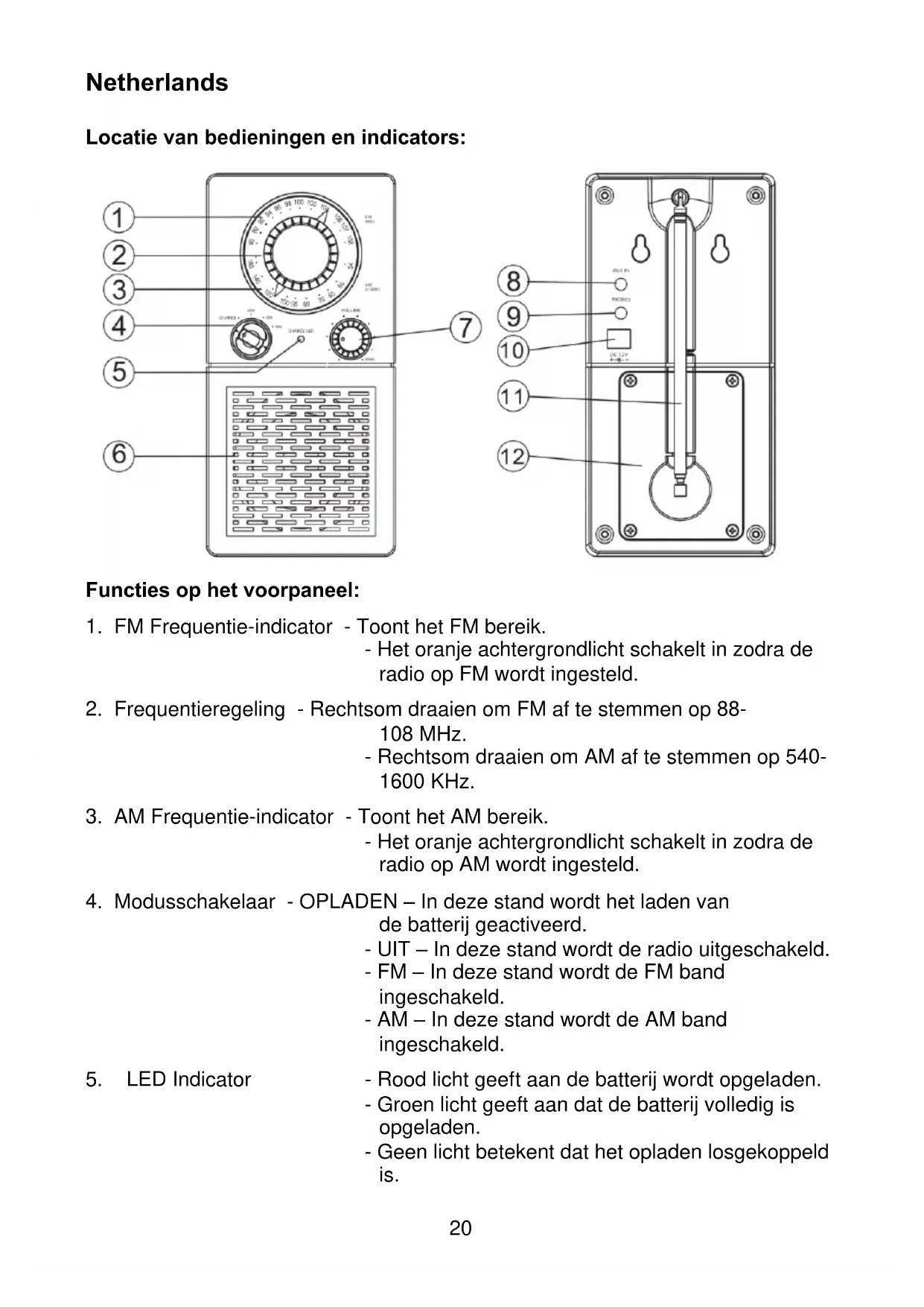 Schakel het apparaat in door de Modusschakelaar op FM of AM te zetten. - Rood Licht in de LED indicator zal knipperen wonneer de batterijen worden opgeladen.