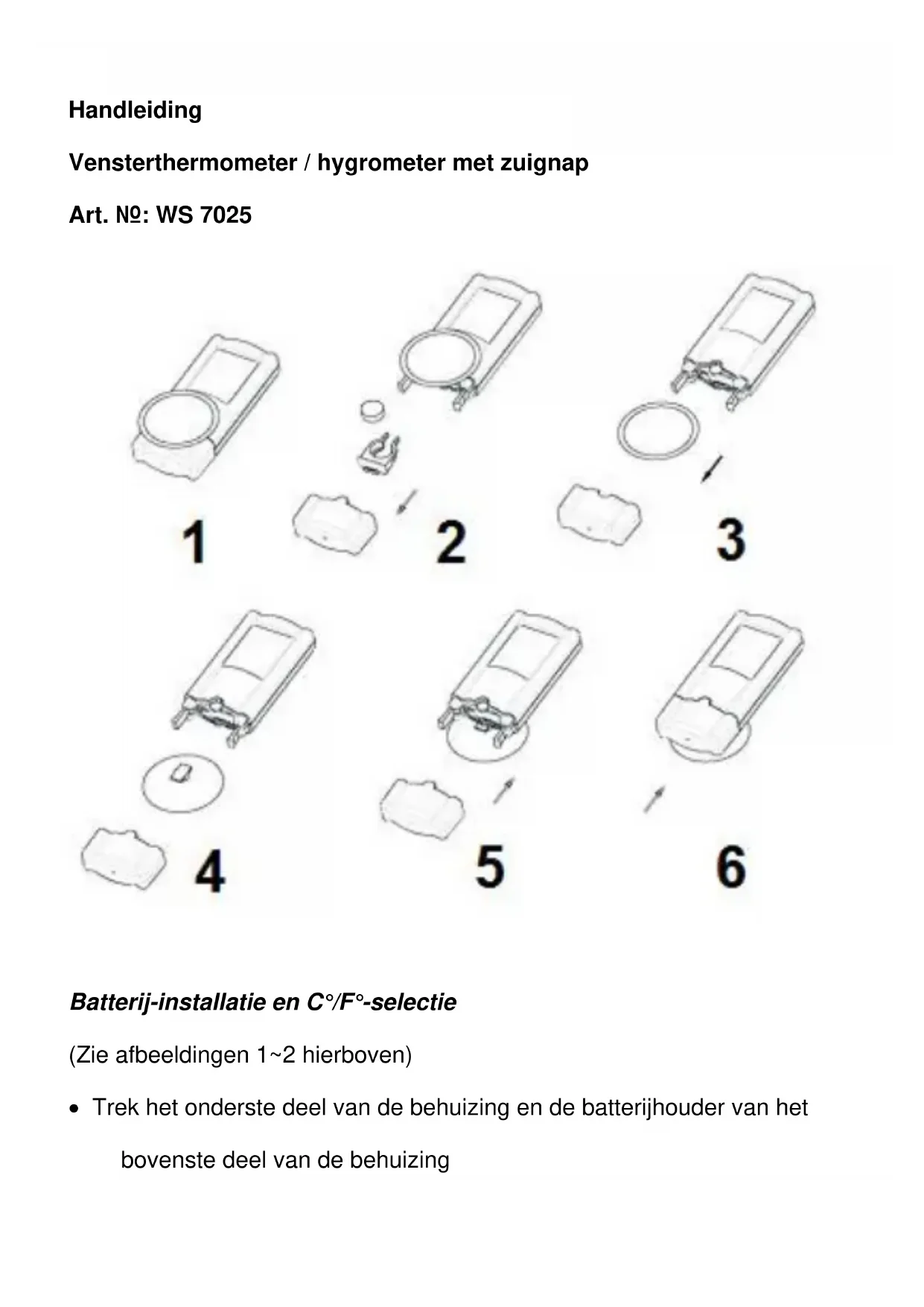Batterij-installatie en C°/F°-selectie (Zie afbeeldingen 1~2 hierboven) Trek het onderste deel van de behuizing en de batterijhouder van het bovenste deel van de behuizing Plaats de batterijen en let hierbij op de juiste polariteit Schuif de selector op Fahrenheit of Celsius. Steek het onderste deel van de behuizing weer op het bovenste deel. Veranderen van buiten- naar binnenaanzicht (zie afbeeldingen 3~6 hierboven) De thermometer met zuignap is gemonteerd voor buitenaanzicht. Om dit te veranderen in binnenaanzicht, gaat u als volgt te werk: Trek het onderste deel van de behuizing van het bovenste deel van de behuizing. Verwijder de zuignap van het onderste deel van de behuizing. Draai het onderste deel van de behuizing en de zuignap 180 graden. Schuif de zuignap weer op zijn plaats. Steek het onderste deel van de behuizing weer op het bovenste deel. Installatie van de thermometer De thermometer kan op vensters, spiegels en vergelijkbare gladde en schone oppervlakken worden bevestigd. De zuignap houdt niet op hout en pleisterlagen. Maak het oppervlak schoon en vetvrij. Voor het aanbrengen van de thermometer drukt u de zuignap stevig ophet gekozen oppervlak. Controleer of de zuignap goed op het oppervlak hecht. Technische gegevens: Temperatuurbereik: -4°F tot 140°F ( -20°C tot 60°C) Temperatuurtolerantie: +/- 1.8°F (+/-1.0°C) °C/°F instelbaar Hygrometerbereik: 20 % tot 95% Hygrometertolerantie: +/-5% van 30% tot 90% ; +/-7% van 20% tot 29% en 91% tot 95% Gebruikt (1) LR44 of AG13 knoopcelbatterij Vorrzorgsmaatregelen Dit hoofdapparaat is uitsluitend bestemd voor binnenshuis gebruik. Stel het apparaat niet bloot aan overmatige krachten of schokken. Stel het apparaat niet bloot aan hoge temperaturen, direct zonlicht, stof en vocht. Niet onderdompelen het apparaat in water Vermijd contact met bijtende stoffen. Gebruik het apparaat niet in een vuur. Deze kan ontploffen. Niet open de behuizing en niet manipuleren structurele componenten van het apparaat. Batterijvoorschriften Gebruik uitsluitend alkaline batterijen, geen oplaadbare batterijen. Installeer batterijen correct volgens de polariteitmarkeringen (+/-). Vervang altijd een volledige set batterijen. Combineer nooit gebruikte en nieuwe batterijen. Verwijder onmiddellijk uitgeputte batterijen. Verwijder batterijen wanneer niet in gebruik. Batterijen nooit opladen of in vuur werpen om ontploffing te voorkomen. Houd de batterijen niet in de nabijheid van metalen voorwerpen. Een contact kan een kortsluiting veroorzaken. Houd alle batterijen buiten bereik van kinderen omdat ze een verstikkingsgevaar vormen. Bewaar de verpakking voor eventueel toekomstig gebruik. Gebruik het product alleen voor het doel waarvoor deze bestemd! Verordening verwijdering batterijen Oude batterijen horen niet in het huisvuil. Als batterijen in het milieu terechtkomen kunnen deze milieu en gezondheidsproblemen tot gevolg hebben. U kunt gebruikte batterijen kosteloos bij uw handelaar of inzamelplaatsen teruggeven. U bent als verbruiker wettelijk verplicht oude batterijen, als omschreven, in te leveren. Verordening verwijdering elektrische apparaten Dit symbool betekent dat elektrische apparatuur, wanneer hij het eind van zijn levensduur bereikt, niet mag worden afgevoerd met het gewone huishoudelijk afval. Breng de apparaat naar het plaatselijke inzamelpunt voor afval of recyclingcentrum. Dit is van toepassing voor alle landen van de Europese Unie en op de overige Europese landen met een systeem voor gescheiden afvalinzameling.Istruzioni per l'uso Termometro/Igrometro da finestra con ventosa art. n.: WS 7025 Installazione della batteria e selezione C°/F° (Vedi figure sopra 1~2) Sfilare la parte inferiore della cassa e poi estrarre il vano batterie dalla parte superiore. Inserire le batterie facendo attenzione alle corrette polarità. Spostare il selettore su Fahrenheit o Celsius. Riassemblare di nuovo la parte superiore della cassa con quella inferiore. Riconfigurazione da visuale esterna a visuale interna (Vedere immagini in alto 3-6) Il termometro con ventosa è stato impostato per la visuale esterna. Per la riconfigurazione a visuale interna, procedere come descritto di seguito: Sfilare la parte inferiore della cassa da quella superiore. Sfilare la ventosa dalla parte superiore della cassa. Ruotare la parte inferiore della cassa e la ventosa di 180 gradi. Risistemare di nuovo la ventosa al suo posto. Riassemblare la parte superiore della cassa con quella inferiore. Installazione del termometro Il termometro può essere fissato a finestre, specchi o ad analoghe superfici lisce e pulite. La ventosa non fa presa su legno e intonaco. Pulire la superficie da grasso o altri residui. Per collocare il termometro, premere la ventosa contro la superficie desiderata. Assicurarsi che la ventosa sia ben fissata alla superficie.Dati tecnici: Temperatura di funzionamento: -4°F fino a 140°F ( -20°C fino a 60°C) Tolleranza a temperature: +/- 1.8°F (+/-1.0°C) °C/°F selezionabile Portata igrometro: 20% fino a 95% Tolleranza igrometro: +/-5% da 30% fino a 90% ; +/-7% da 20% fino a 29% e 91% fino a 95% Utilizza (1) pile a bottone LR44 oppure AG13 Precauzioni Il dispositivo principale è progettata solo per l'utilizzo in ambienti interni. Non sottoporre il dispositivo a forza eccessiva e urti. Non esporre il dispositivo a temperature estreme, luce solare diretta, polvere o umidità. Non immergere il dispositivo in acqua. Evitare il contatto con materiali corrosivi. Non gettare il dispositivo nel fuoco perché potrebbe esplodere. Non aprire la cassa interna o manomettere i componenti di questa dispositivo. Avvertenze per l'uso sicuro delle batterie Uilizzare solo batterie alcaline. Non utilizzare batterie ricaricabili. Installare le batterie correttamente rispettando le polarità (+/-). Sostituire sempre il set completo di batterie. Non mescolare mai batterie usate e nuove. Rimuovere immediatamente le batterie scariche. Rimuovere le batterie quando non sono utilizza