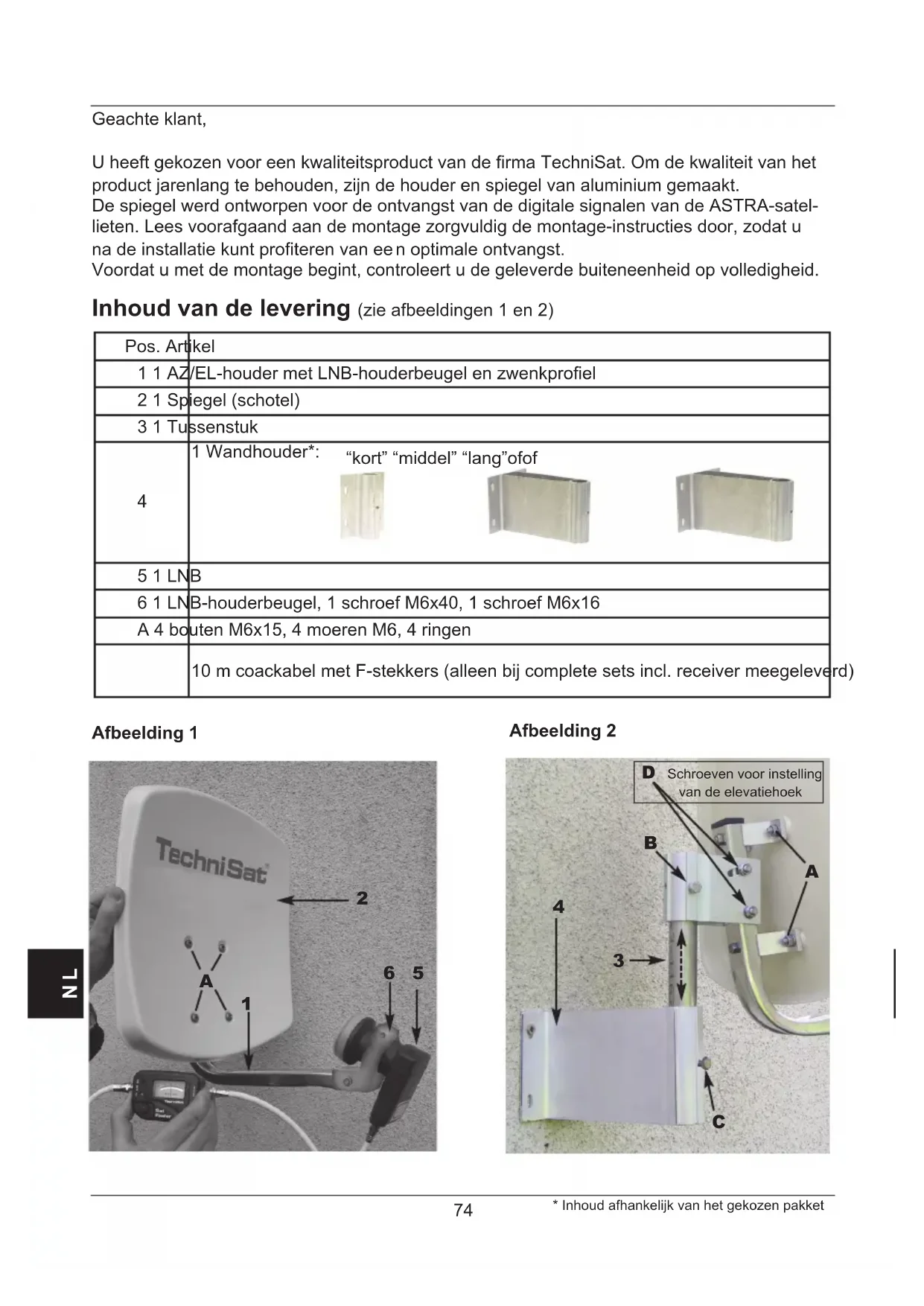 D Schroeven voor instelling van de elevatiehoek Afbeelding 1 Afbeelding 2 Pos. Artikel 1 1 AZ/EL-houder met LNB-houderbeugel en zwenkprofiel 2 1 Spiegel (schotel) 3 1 Tussenstuk