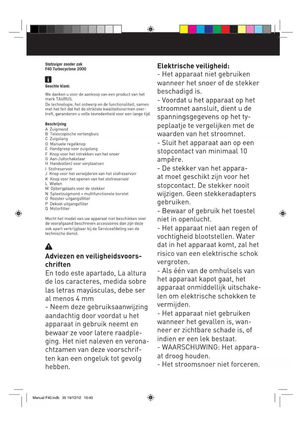Download de handleiding voor uw Stofzuiger in PDF-formaat gratis! Vind uw handleiding F40 Turbocyclone 2000 - TAURUS en neem uw elektronisch apparaat weer in handen. Op deze pagina staan alle documenten die nodig zijn voor het gebruik van uw apparaat. F40 Turbocyclone 2000 van het merk TAURUS.