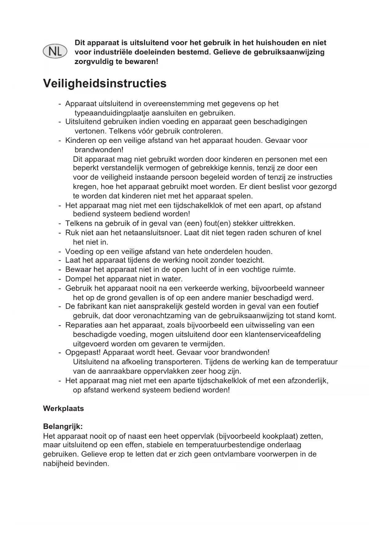 Het apparaat nooit op of naast een heet oppervlak (bijvoorbeeld kookplaat) zetten,