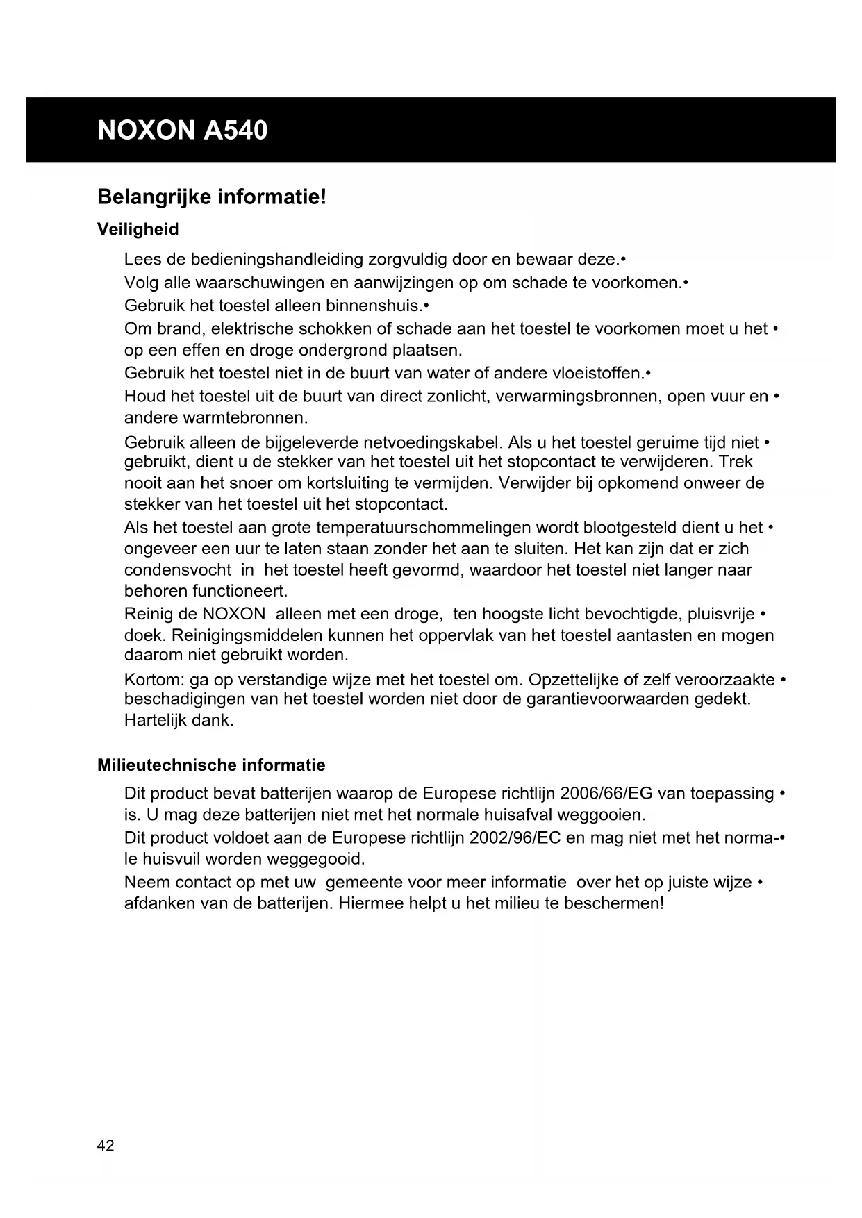 Belangrijke informatie! Veiligheid Lees de bedieningshandleiding zorgvuldig door en bewaar deze.• Volg alle waarschuwingen en aanwijzingen op om schade te voorkomen.• Gebruik het toestel alleen binnenshuis.• Om brand, elektrische schokken of schade aan het toestel te voorkomen moet u het • op een effen en droge ondergrond plaatsen. Gebruik het toestel niet in de buurt van water of andere vloeistoffen.• Houd het toestel uit de buurt van direct zonlicht, verwarmingsbronnen, open vuur en • andere warmtebronnen. Gebruik alleen de bijgeleverde netvoedingskabel. Als u het toestel geruime tijd niet • gebruikt, dient u de stekker van het toestel uit het stopcontact te verwijderen. Trek nooit aan het snoer om kortsluiting te vermijden. Verwijder bij opkomend onweer de stekker van het toestel uit het stopcontact. Als het toestel aan grote temperatuurschommelingen wordt blootgesteld dient u het • ongeveer een uur te laten staan zonder het aan te sluiten. Het kan zijn dat er zich condensvocht in het toestel heeft gevormd, waardoor het toestel niet langer naar behoren functioneert. Reinig de NOXON alleen met een droge, ten hoogste licht bevochtigde, pluisvrije • doek. Reinigingsmiddelen kunnen het oppervlak van het toestel aantasten en mogen daarom niet gebruikt worden. Kortom: ga op verstandige wijze met het toestel om. Opzettelijke of zelf veroorzaakte • beschadigingen van het toestel worden niet door de garantievoorwaarden gedekt. Hartelijk dank. Milieutechnische informatie Dit product bevat batterijen waarop de Europese richtlijn 2006/66/EG van toepassing • is. U mag deze batterijen niet met het normale huisafval weggooien. Dit product voldoet aan de Europese richtlijn 2002/96/EC en mag niet met het norma-• le huisvuil worden weggegooid. Neem contact op met uw gemeente voor meer informatie over het op juiste wijze • afdanken van de batterijen. Hiermee helpt u het milieu te beschermen!English Nederlands Espanol Italiano Francais Deutsch English