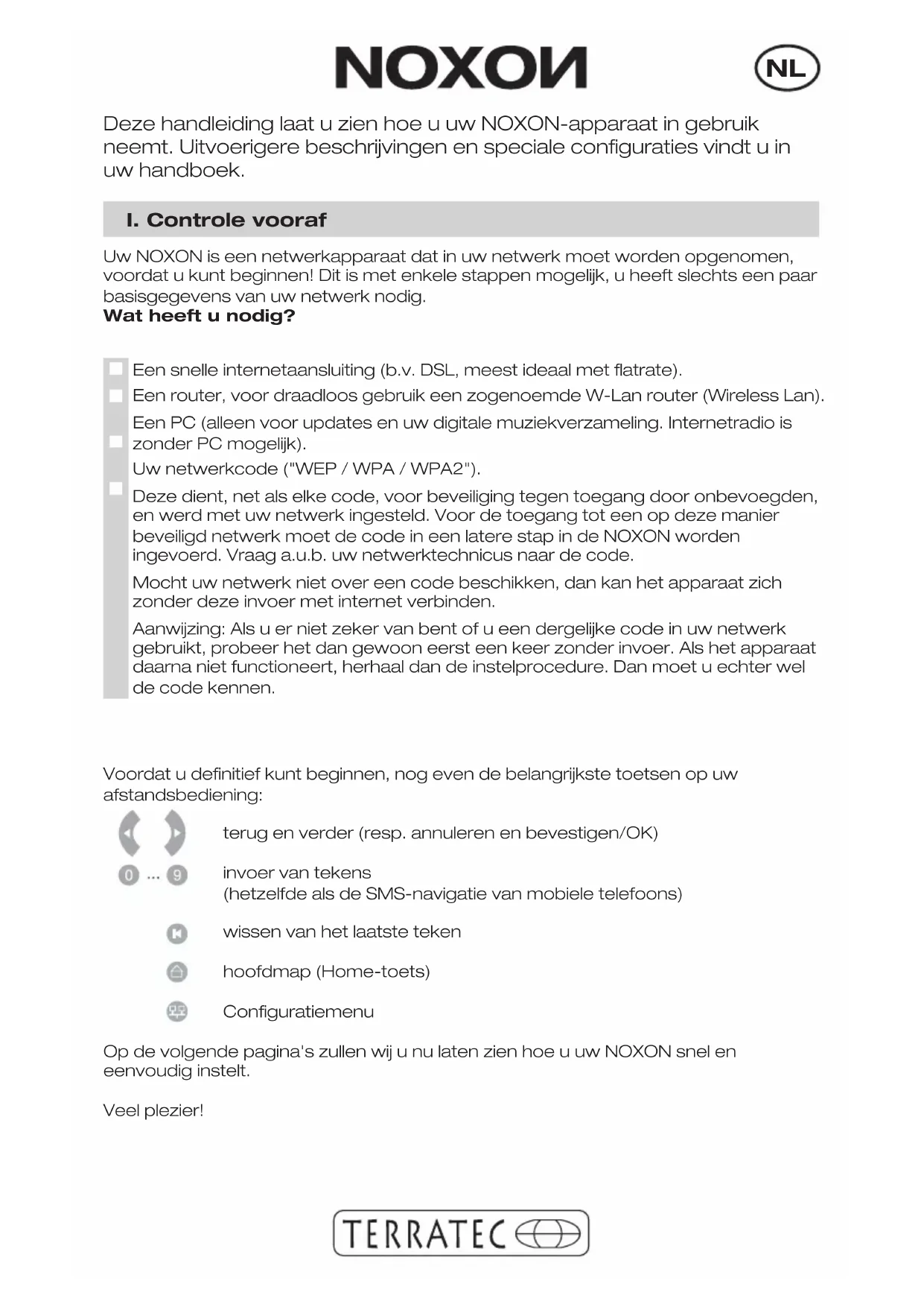 Uw NOXON is een netwerkapparaat dat in uw netwerk moet worden opgenomen, voordat u kunt beginnen! Dit is met enkele stappen mogelijk, u heeft slechts een paar basisgegevens van uw netwerk nodig. Een snelle internetaansluiting (b.v. DSL, meest ideaal met flatrate). Een router, voor draadloos gebruik een zogenoemde W-Lan router (Wireless Lan). Een PC (alleen voor updates en uw digitale muziekverzameling. Internetradio is zonder PC mogelijk). Uw netwerkcode ("WEP / WPA / WPA2"). Deze dient, net als elke code, voor beveiliging tegen toegang door onbevoegden, en werd met uw netwerk ingesteld. Voor de toegang tot een op deze manier beveiligd netwerk moet de code in een latere stap in de NOXON worden ingevoerd. Vraag a.u.b. uw netwerktechnicus naar de code. Mocht uw netwerk niet over een code beschikken, dan kan het apparaat zich zonder deze invoer met internet verbinden. Aanwijzing: Als u er niet zeker van bent of u een dergelijke code in uw netwerk gebruikt, probeer het dan gewoon eerst een keer zonder invoer. Als het apparaat daarna niet functioneert, herhaal dan de instelprocedure. Dan moet u echter wel de code kennen. Wat heeft u nodig? Voordat u definitief kunt beginnen, nog even de belangrijkste toetsen op uw afstandsbediening: terug en verder (resp. annuleren en bevestigen/OK) invoer van tekens (hetzelfde als de SMS-navigatie van mobiele telefoons) wissen van het laatste teken hoofdmap (Home-toets) Configuratiemenu Op de volgende pagina's zullen wij u nu laten zien hoe u uw NOXON snel en eenvoudig instelt. Veel plezier!NL Voordat u het apparaat kunt configureren, moet u nog… … de voedingseenheid, de antenne en evt. de netwerkkabel (wanneer u geen draadloos netwerk gebruikt) aansluiten...