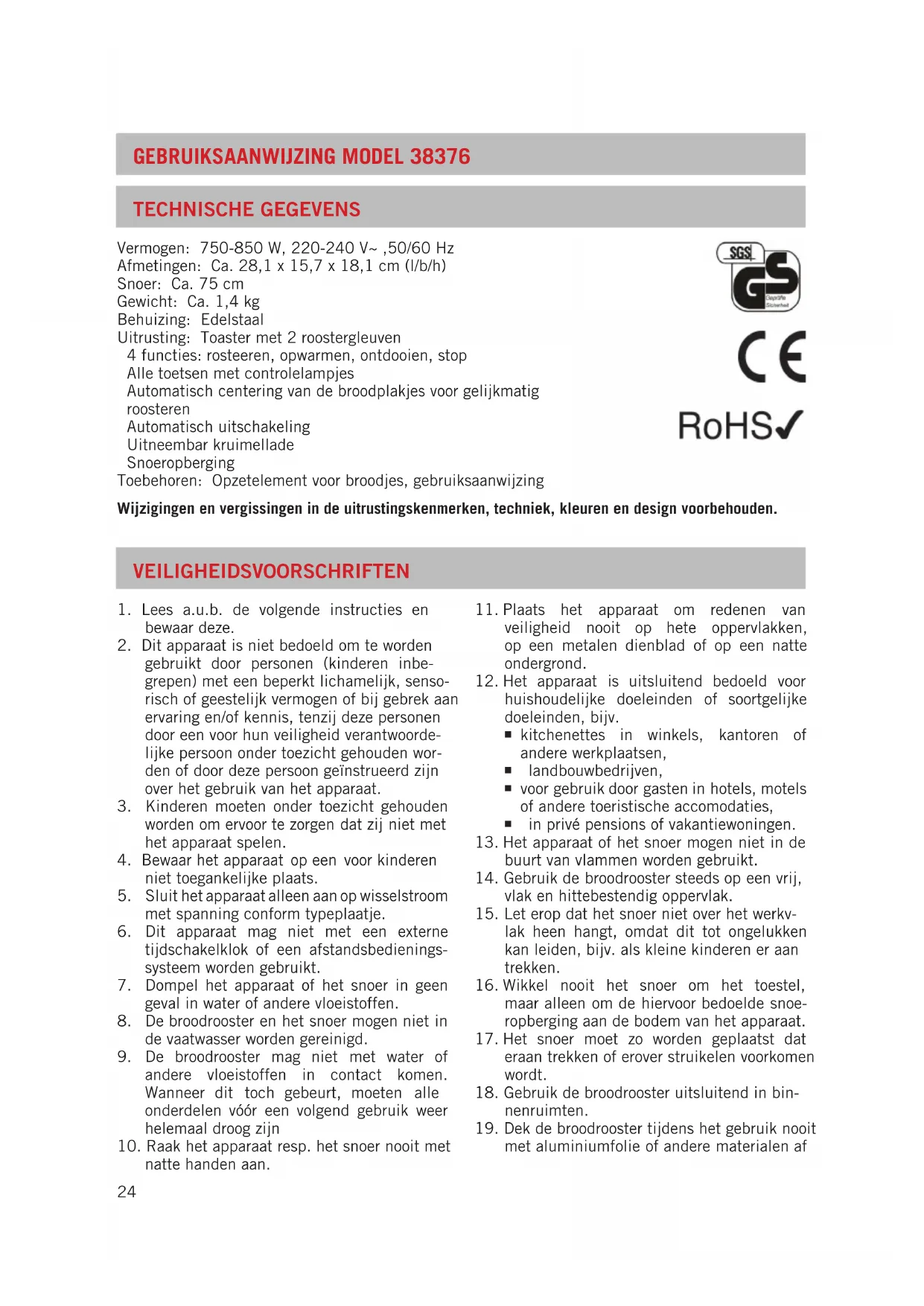 VeiligheidsVoorschrifTen Technische gegeVens Vermogen: 750-850 W, 220-240 V~ ,50/60 Hz Afmetingen: Ca. 28,1 x 15,7 x 18,1 cm (l/b/h) Snoer: Ca. 75 cm Gewicht: Ca. 1,4 kg Behuizing: Edelstaal Uitrusting: Toaster met 2 roostergleuven 4 functies: rosteeren, opwarmen, ontdooien, stop Alle toetsen met controlelampjes Automatisch centering van de broodplakjes voor gelijkmatig roosteren Automatisch uitschakeling Uitneembar kruimellade Snoeropberging Toebehoren: Opzetelement voor broodjes, gebruiksaanwijzing