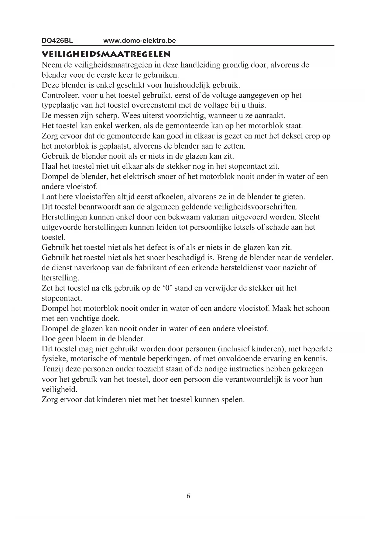 VEILIGHEIDSMAATREGELEN Neem de veiligheidsmaatregelen in deze handleiding grondig door, alvorens de blender voor de eerste keer te gebruiken. Deze blender is enkel geschikt voor huishoudelijk gebruik. Controleer, voor u het toestel gebruikt, eerst of de voltage aangegeven op het typeplaatje van het toestel overeenstemt met de voltage bij u thuis. De messen zijn scherp. Wees uiterst voorzichtig, wanneer u ze aanraakt. Het toestel kan enkel werken, als de gemonteerde kan op het motorblok staat. Zorg ervoor dat de gemonteerde kan goed in elkaar is gezet en met het deksel erop op het motorblok is geplaatst, alvorens de blender aan te zetten. Gebruik de blender nooit als er niets in de glazen kan zit. Haal het toestel niet uit elkaar als de stekker nog in het stopcontact zit. Dompel de blender, het elektrisch snoer of het motorblok nooit onder in water of een andere vloeistof. Laat hete vloeistoffen altijd eerst afkoelen, alvorens ze in de blender te gieten. Dit toestel beantwoordt aan de algemeen geldende veiligheidsvoorschriften. Herstellingen kunnen enkel door een bekwaam vakman uitgevoerd worden. Slecht uitgevoerde herstellingen kunnen leiden tot persoonlijke letsels of schade aan het toestel. Gebruik het toestel niet als het defect is of als er niets in de glazen kan zit. Gebruik het toestel niet als het snoer beschadigd is. Breng de blender naar de verdeler, de dienst naverkoop van de fabrikant of een erkende hersteldienst voor nazicht of herstelling. Zet het toestel na elk gebruik op de ‘0’ stand en verwijder de stekker uit het stopcontact. Dompel het motorblok nooit onder in water of een andere vloeistof. Maak het schoon met een vochtige doek. Dompel de glazen kan nooit onder in water of een andere vloeistof. Doe geen bloem in de blender. Dit toestel mag niet gebruikt worden door personen (inclusief kinderen), met beperkte fysieke, motorische of mentale beperkingen, of met onvoldoende ervaring en kennis. Tenzij deze personen onder toezicht staan of de nodige instructies hebben gekregen voor het gebruik van het toestel, door een persoon die verantwoordelijk is voor hun veiligheid. Zorg ervoor dat kinderen niet met het toestel kunnen spelen.www.domo-elektro.be DO426BL