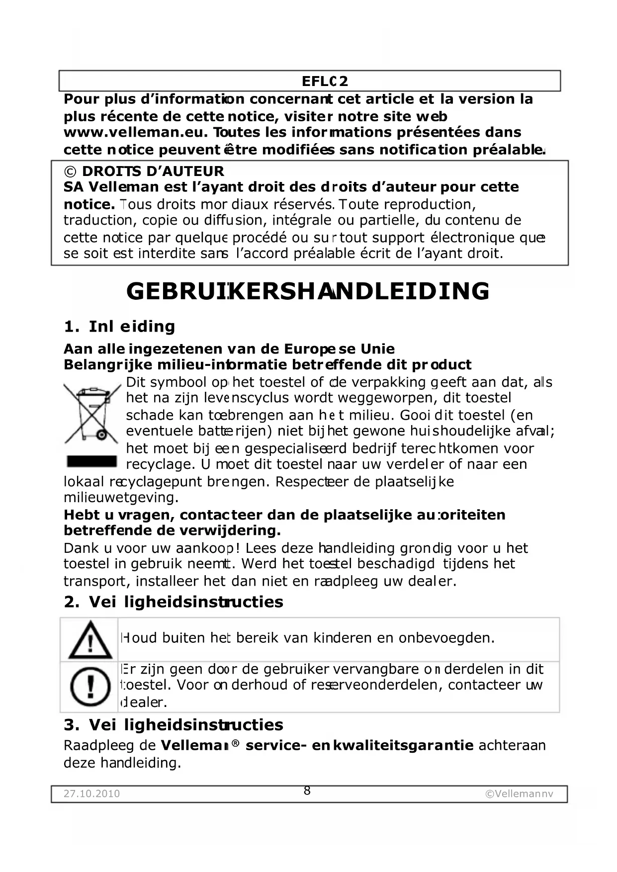 Gebruik dit toestel enkel met origirele accessoires. Velleman nv is Niet aansprakelijk voor schade of kwetsuren bij (verkeerd) gebruik van dit toestel. Voor meer informatie over dit product en de meest recente ver sie van deze handleiding, zich www.VELLEMAN.eu. De informatie in deze handleiding kan te allenlijke worden gew ijzigd zonder voorafgaande kennisgeving.