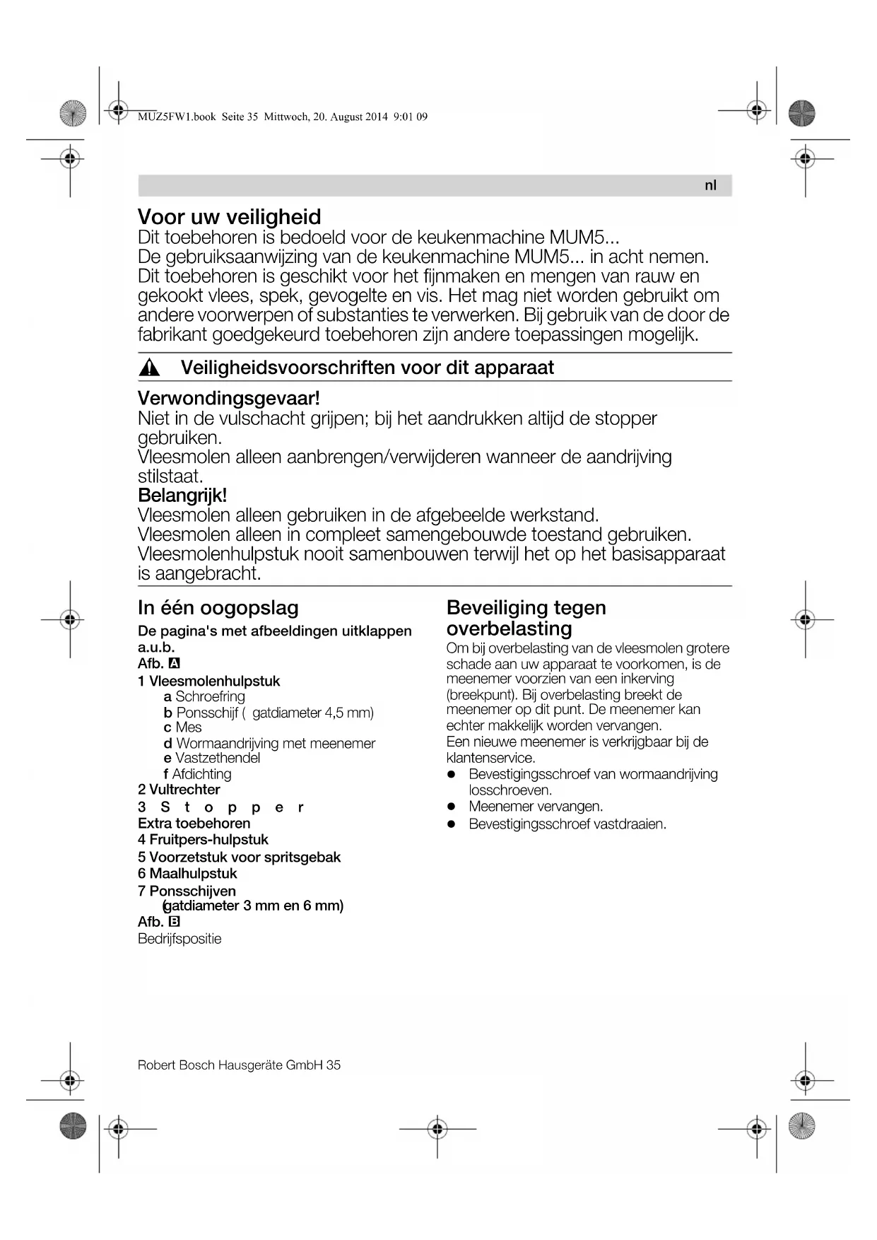 Con riserva di modifiche. MUZ5FW1.book Seite 34 Mittwoch, 20. August 2014 9:01 09Robert Bosch Hausgeräte GmbH 35 Voor uw veiligheid Dit toebehoren is bedoeld voor de keukenmachine MUM5... De gebruiksaanwijzing van de keukenmachine MUM5... in acht nemen. Dit toebehoren is geschikt voor het fijnmaken en mengen van rauw en gekookt vlees, spek, gevogelte en vis. Het mag niet worden gebruikt om andere voorwerpen of substanties te verwerken. Bij gebruik van de door de fabrikant goedgekeurd toebehoren zijn andere toepassingen mogelijk. , Veiligheidsvoorschriften voor dit apparaat Verwondingsgevaar! Niet in de vulschacht grijpen; bij het aandrukken altijd de stopper gebruiken. Vleesmolen alleen aanbrengen/verwijderen wanneer de aandrijving stilstaat. Belangrijk! Vleesmolen alleen gebruiken in de afgebeelde werkstand. Vleesmolen alleen in compleet samengebouwde toestand gebruiken. Vleesmolenhulpstuk nooit samenbouwen terwijl het op het basisapparaat is aangebracht. In één oogopslag De pagina's met afbeeldingen uitklappen a.u.b. Afb. 1 Vleesmolenhulpstuk a Schroefring b Ponsschijf ( gatdiameter 4,5 mm