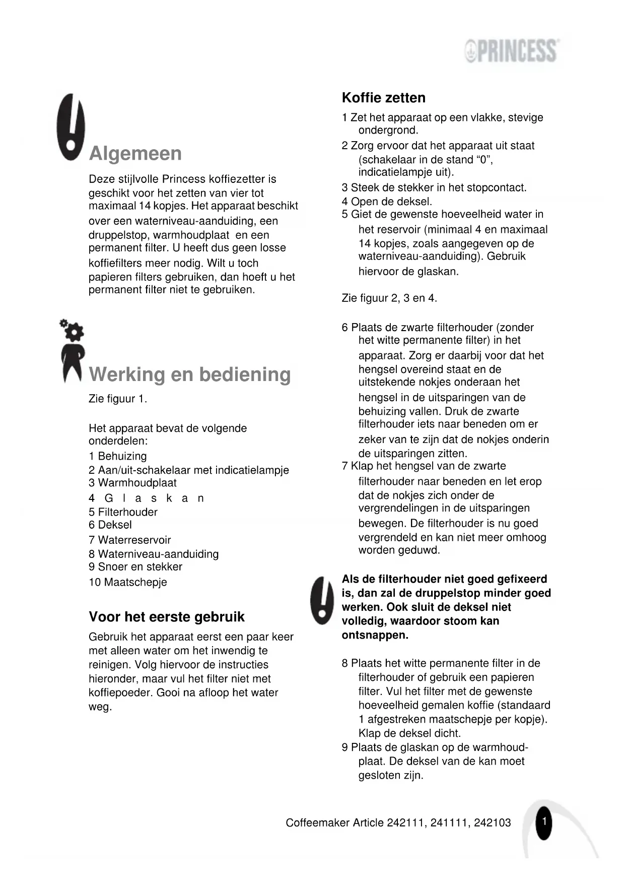 Princess_Grand_Cafe_Torino_omslag.fm Page 2 Thursday, August 17, 2006 5:03 PM1 Coffeemaker Article 242111, 241111, 242103 Algemeen Deze stijlvolle Princess koffiezetter is geschikt voor het zetten van vier tot maximaal 14 kopjes. Het apparaat beschikt over een waterniveau-aanduiding, een druppelstop, warmhoudplaat en een permanent filter. U heeft dus geen losse koffiefilters meer nodig. Wilt u toch papieren filters gebruiken, dan hoeft u het permanent filter niet te gebruiken. Werking en bediening Zie figuur 1. Het apparaat bevat de volgende onderdelen: 1 Behuizing 2 Aan/uit-schakelaar met indicatielampje 3 Warmhoudplaat 4Glaskan 5 Filterhouder 6 Deksel 7 Waterreservoir 8 Waterniveau-aanduiding 9 Snoer en stekker 10 Maatschepje Voor het eerste gebruik Gebruik het apparaat eerst een paar keer met alleen water om het inwendig te reinigen. Volg hiervoor de instructies hieronder, maar vul het filter niet met koffiepoeder. Gooi na afloop het water weg. Koffie zetten 1 Zet het apparaat op een vlakke, stevige ondergrond. 2 Zorg ervoor dat het apparaat uit staat (schakelaar in de stand “0”, indicatielampje uit). 3 Steek de stekker in het stopcontact. 4 Open de deksel. 5 Giet de gewenste hoeveelheid water in het reservoir (minimaal 4 en maximaal 14 kopjes, zoals aangegeven op de waterniveau-aanduiding). Gebruik hiervoor de glaskan. Zie figuur 2, 3 en 4. 6 Plaats de zwarte filterhouder (zonder het witte permanente filter) in het apparaat. Zorg er daarbij voor dat het hengsel overeind staat en de uitstekende nokjes onderaan het hengsel in de uitsparingen van de behuizing vallen. Druk de zwarte filterhouder iets naar beneden om er zeker van te zijn dat de nokjes onderin de uitsparingen zitten. 7 Klap het hengsel van de zwarte filterhouder naar beneden en let erop dat de nokjes zich onder de vergrendelingen in de uitsparingen bewegen. De filterhouder is nu goed vergrendeld en kan niet meer omhoog worden geduwd. Als de filterhouder niet goed gefixeerd is, dan zal de druppelstop minder goed werken. Ook sluit de deksel niet volledig, waardoor stoom kan ontsnappen. 8 Plaats het witte permanente filter in de filterhouder of gebruik een papieren filter. Vul het filter met de gewenste hoeveelheid gemalen koffie (standaard 1 afgestreken maatschepje per kopje). Klap de deksel dicht. 9 Plaats de glaskan op de warmhoud- plaat. De deksel van de kan moet gesloten zijn.2 Coffeemaker Article 242111, 241111, 242103 10 Zet het apparaat aan (schakelaar in de stand “1”). Het aan/uit-indicatielampje gaat aan. De koffie wordt gezet. De warmhoudplaat houdt de koffie op temperatuur. 11 Neem de glaskan van de warmhoud- plaat om een kopje koffie in te schenken. Het apparaat heeft een druppelstop. De koffie hoeft dus niet geheel door te lopen voordat u de kan van de warmhoudplaat neemt. 12 Zet het apparaat na gebruik uit (schakelaar in de stand “0” ) en neem de stekker uit het stopcontact. Onderhoud en reinigen