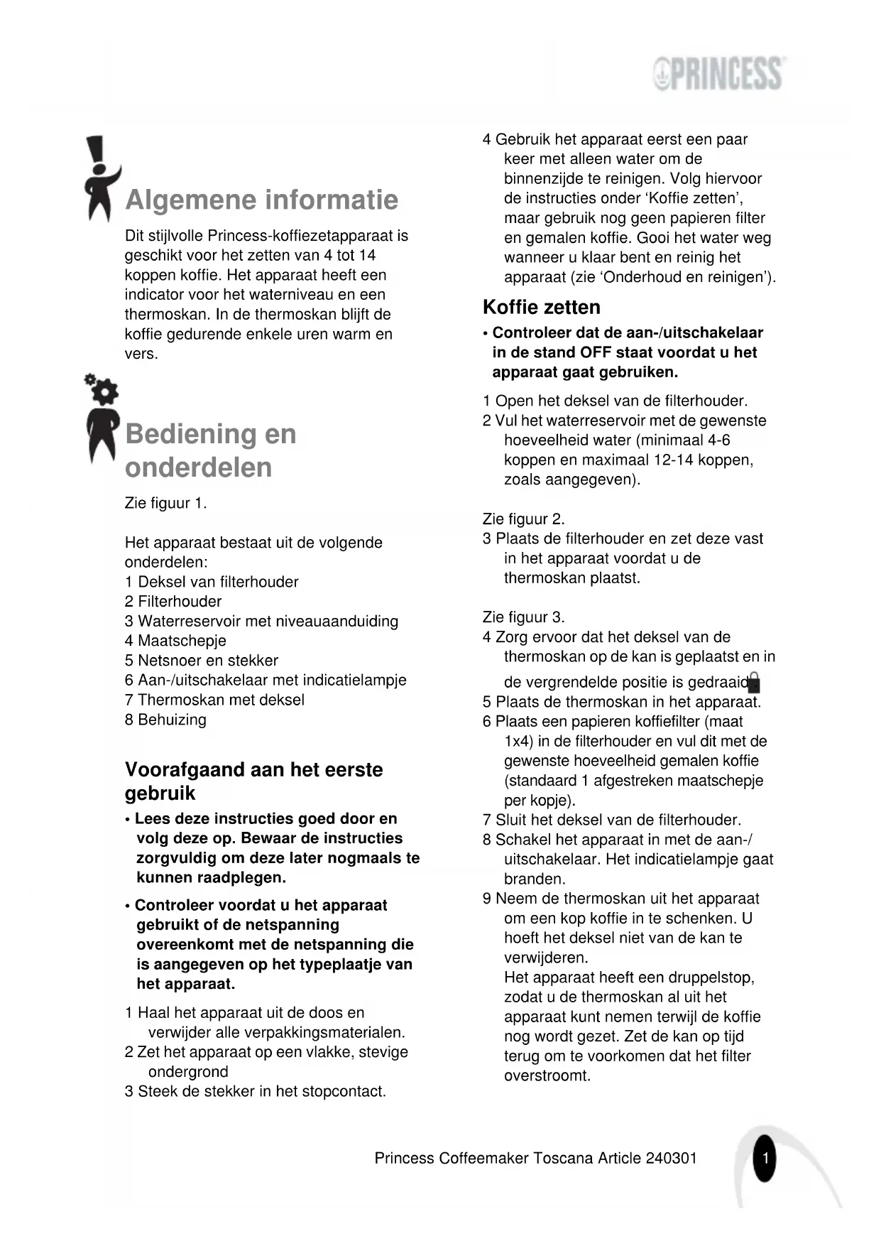 July 2008 V01 Princess Coffeemaker Toscana Article 240301 Algemene informatie Dit stijlvolle Princess-koffiezetapparaat is geschikt voor het zetten van 4 tot 14 koppen koffie. Het apparaat heeft een indicator voor het waterniveau en een thermoskan. In de thermoskan blijft de koffie gedurende enkele uren warm en vers. Bediening en onderdelen Zie figuur 1. Het apparaat bestaat uit de volgende onderdelen: 1 Deksel van filterhouder 2 Filterhouder 3 Waterreservoir met niveauaanduiding 4 Maatschepje 5 Netsnoer en stekker 6 Aan-/uitschakelaar met indicatielampje 7 Thermoskan met deksel 8 Behuizing Voorafgaand aan het eerste gebruik