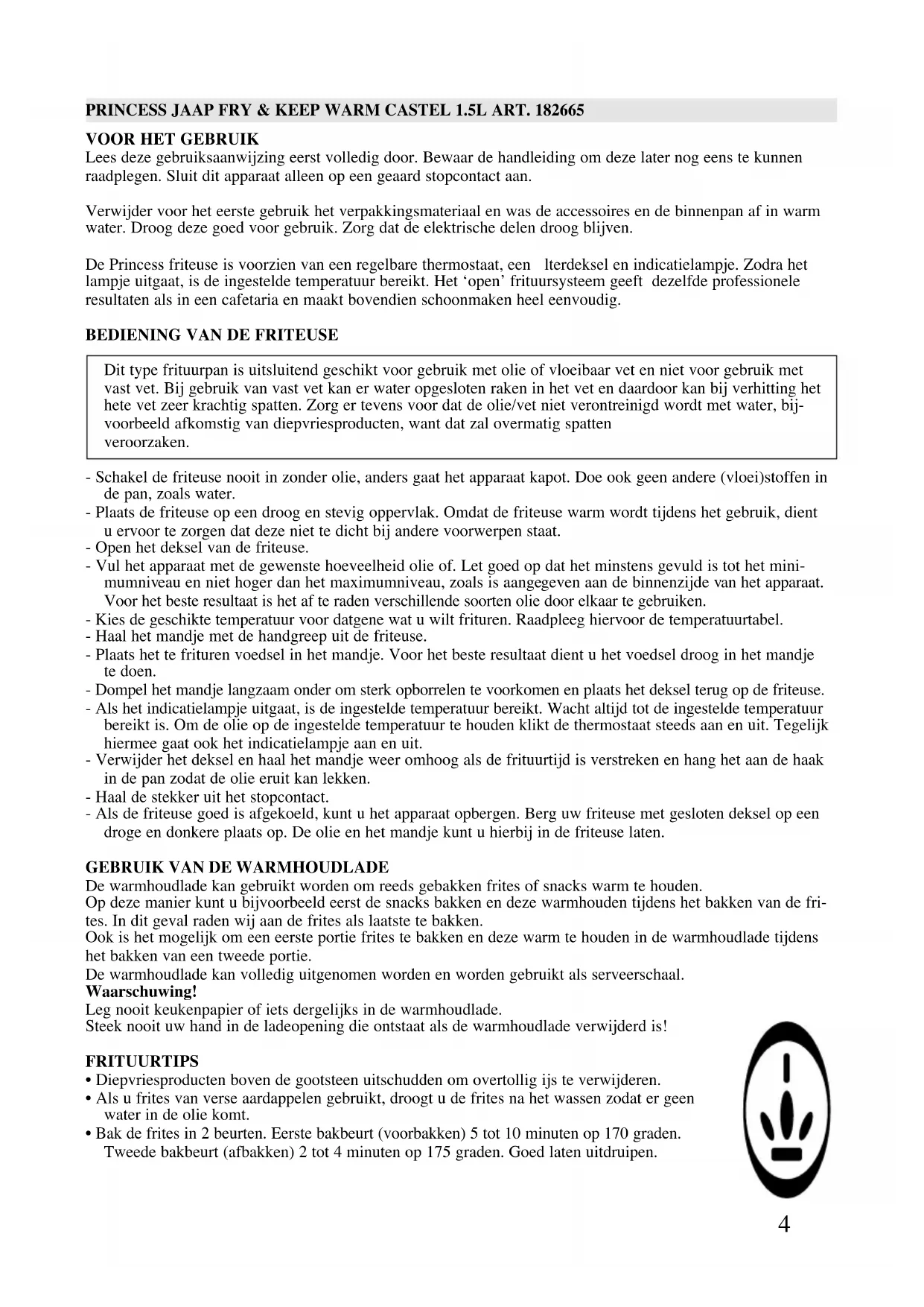 BEDIENING VAN DE FRITEUSE Dit type frituurpan is uitsluitend geschikt voor gebruik met olie of vloeibaar vet en niet voor gebruik met