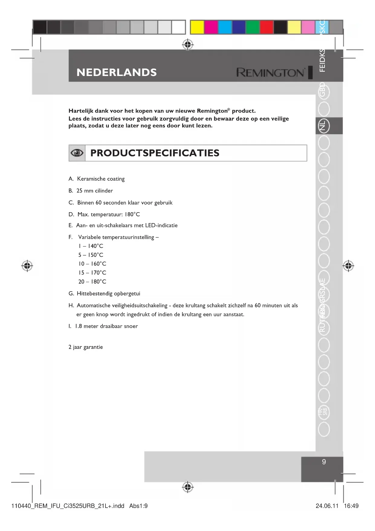SRB NL Hartelijk dank voor het kopen van uw nieuwe Remington ® product.Lees de instructies voor gebruik zorgvuldig door en bewaar deze op een veilige plaats, zodat u deze later nog eens door kunt lezen. PRODUCTSPECIFICATIES A. Keramische coatingB. 25 mm cilinderC. Binnen 60 seconden klaar voor gebruikD. Max. temperatuur: 180°CE. Aan- en uit-schakelaars met LED-indicatieF. Variabele temperatuurinstelling –1 – 140°C5 – 150°C10 – 160°C15 – 170°C20 – 180°CG. Hittebestendig opbergetui H. Automatische veiligheidsuitschakeling - deze krultang schakelt zichzelf na 60 minuten uit als er geen knop wordt ingedrukt of indien de krultang een uur aanstaat.I. 1.8 meter draaibaar snoer2 jaar garantie110440_REM_IFU_Ci3525URB_21L+.indd Abs1:9 24.06.11 16:49NEDERLANDS