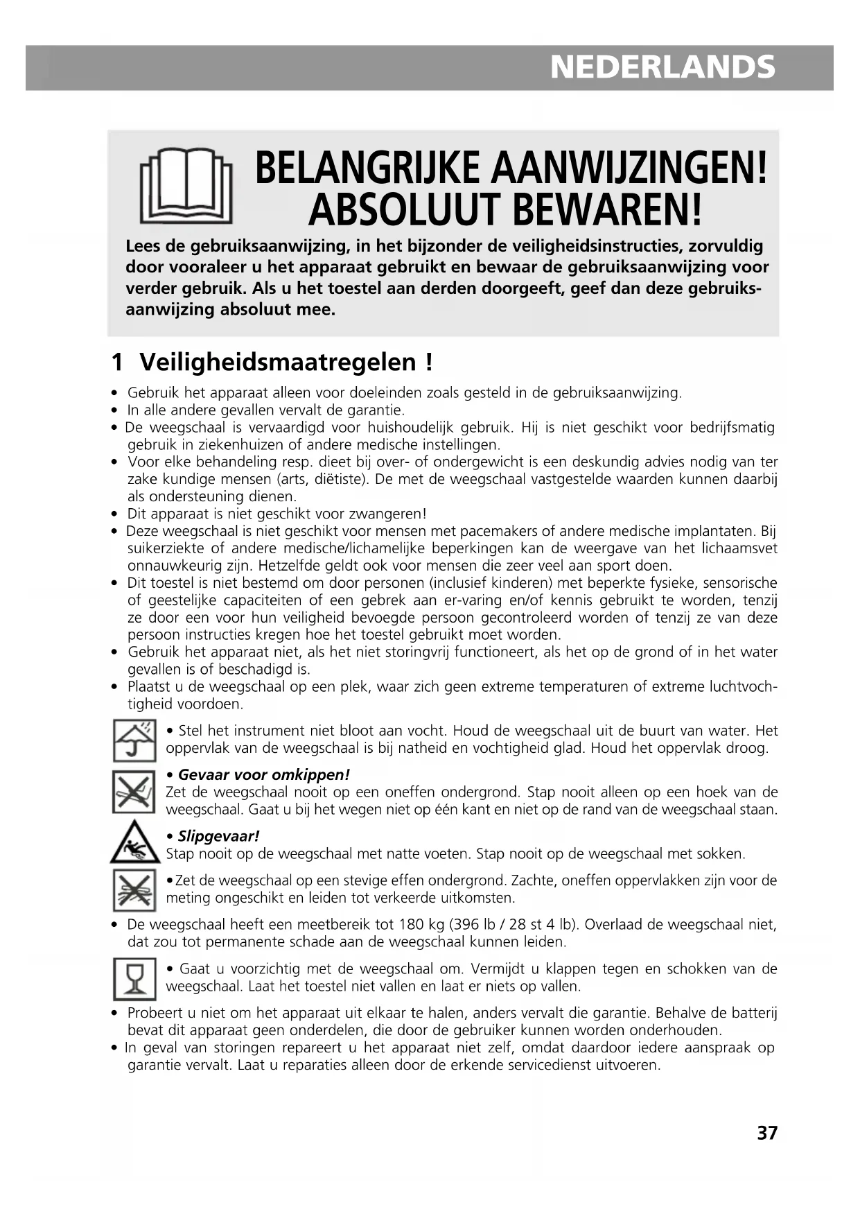 - Gebruik het apparaat alleen voor doeleinden zoals gesteld in de gebruiksaanwijzing.• In alle andere gevallen vervalt de garantie.• De weegschaal is vervaardigd voor huishoudelijk gebruik. Hij is niet geschikt voor bedrijfsmatiggebruik in ziekenhuizen of andere medische instellingen.• Voor elke behandeling resp. dieet bij over- of ondergewicht is een deskundig advies nodig van terzake kundige mensen (arts, diëtiste). De met de weegschaal vastgestelde waarden kunnen daarbijals ondersteuning dienen.• Dit apparaat is niet geschikt voor zwangeren!• Deze weegschaal is niet geschikt voor mensen met pacemakers of andere medische implantaten. Bijsuikerziekte of andere medische/lichamelijke beperkingen kan de weergave van het lichaamsvetonnauwkeurig zijn. Hetzelfde geldt ook voor mensen die zeer veel aan sport doen.• Dit toestel is niet bestemd om door personen (inclusief kinderen) met beperkte fysieke, sensorischeof geestelijke capaciteiten of een gebrek aan er-varing en/of kennis gebruikt te worden, tenzijze door een voor hun veiligheid bevoegde persoon gecontroleerd worden of tenzij ze van dezepersoon instructies kregen hoe het toestel gebruikt moet worden.• Gebruik het apparaat niet, als het niet storingvrij functioneert, als het op de grond of in het watergevallen is of beschadigd is.• Plaatst u de weegschaal op een plek, waar zich geen extreme temperaturen of extreme luchtvoch-tigheid voordoen.• Stel het instrument niet bloot aan vocht. Houd de weegschaal uit de buurt van water. Hetoppervlak van de weegschaal is bij natheid en vochtigheid glad. Houd het oppervlak droog.• Gevaar voor omkippen!Zet de weegschaal nooit op een oneffen ondergrond. Stap nooit alleen op een hoek van deweegschaal. Gaat u bij het wegen niet op één kant en niet op de rand van de weegschaal staan.• Slipgevaar!Stap nooit op de weegschaal met natte voeten. Stap nooit op de weegschaal met sokken. Zet de weegschaal op een stevige effen ondergrond. Zachte, oneffen oppervlakken zijn voor demeting ongeschikt en leiden tot verkeerde uitkomsten.• De weegschaal heeft een meetbereik tot 180 kg (396 lb / 28 st 4 lb). Overlaad de weegschaal niet,dat zou tot permanente schade aan de weegschaal kunnen leiden. Gaat u voorzichtig met de weegschaal om. Vermijdt u klappen tegen en schokken van deweegschaal. Laat het toestel niet vallen en laat er niets op vallen.• Probeert u niet om het apparaat uit elkaar te halen, anders vervalt die garantie. Behalve de batterijbevat dit apparaat geen onderdelen, die door de gebruiker kunnen worden onderhouden.• In geval van storingen repareert u het apparaat niet zelf, omdat daardoor iedere aanspraak opgarantie vervalt. Laat u reparaties alleen door de erkende servicedienst uitvoeren. BELANGRIJKE AANWIJZINGEN! ABSOLUUT BEWAREN! Lees de gebruiksaanwijzing, in het bijzonder de veiligheidsinstructies, zorvuldig door vooraleer u het apparaat gebruikt en bewaar de gebruiksaanwijzing voor verder gebruik. Als u het toestel aan derden doorgeeft, geef dan deze gebruiks- aanwijzing absoluut mee.38 NEDERLANDS Bedankt voor uw vertrouwen en van harte gelukgewenst! Met de Personenweegschaal met lichaamsanalysefunctie BS 475 hebt u een kwaliteitsproduct van MEDISANA gekocht. Dit toestel werd voor het wegen en voor het berekenen van het lichaamsvet- aandeel, watermassa en spiermassa van personen vervaardigd. Voor een succesvol en duurzaam gebruik van de MEDISANA Personenweegschaal met lichaamsanalysefunctie BS 475 raden we u aan om de onderstaande gebruiks- en onderhoudsaanwijzingen zorgvuldig door te lezen. 2 Levering en verpakking Gelieve eerst te controleren of het instrument volledig is en volledig vrij van beschadigingen is. In geval van twijfel neemt u het toestel niet in bedrijf en neemt u contact op met uw handelaar of uw service- punt. Bij de levering horen: